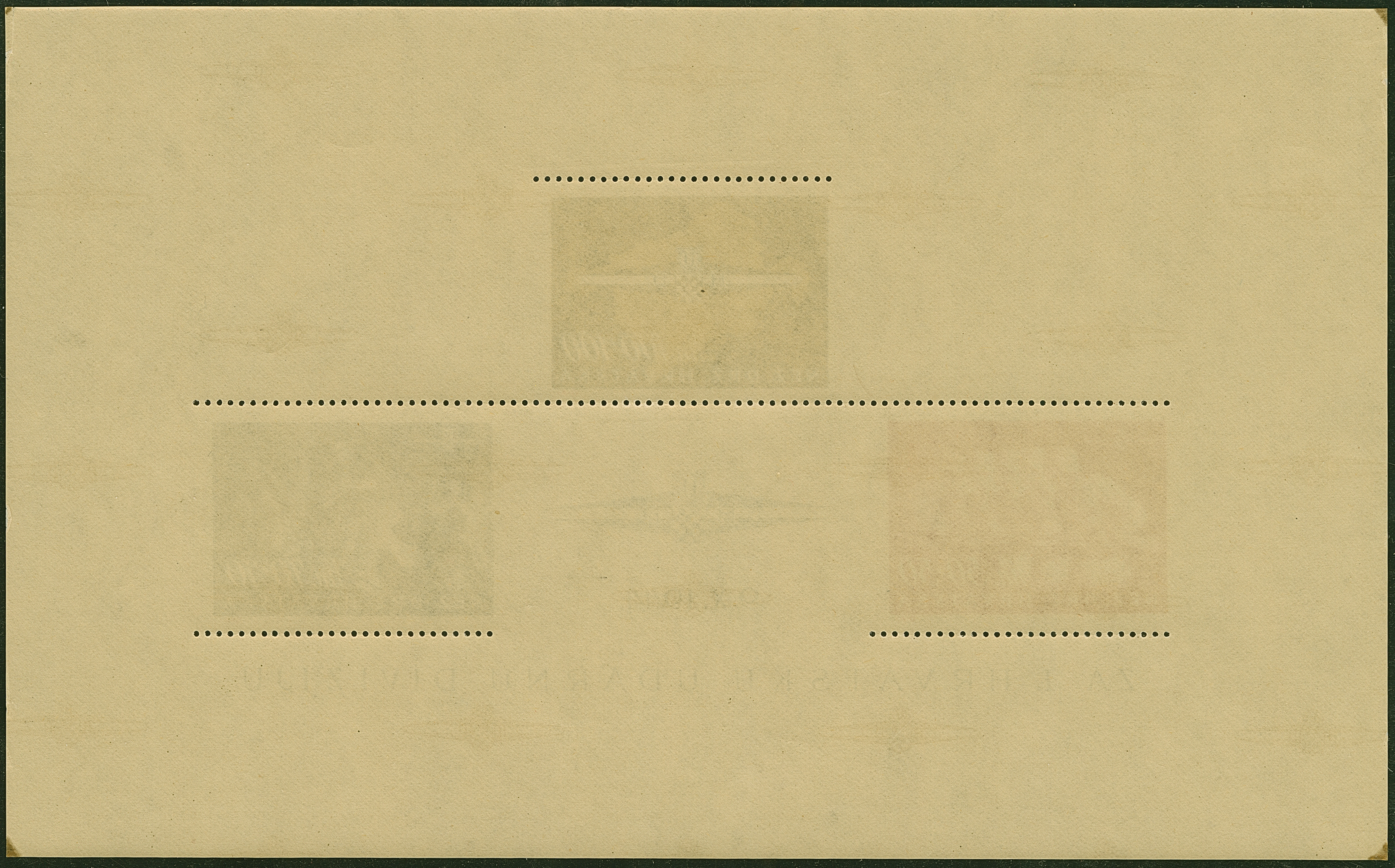 1945, Storm Division souvenir sheet, imperforate proof (230x140mm) with 50 k. brown orange, 70 k. grey black and inscription only, mint never hinged with tiny gum marks from the hinge in the corners, otherwise fine