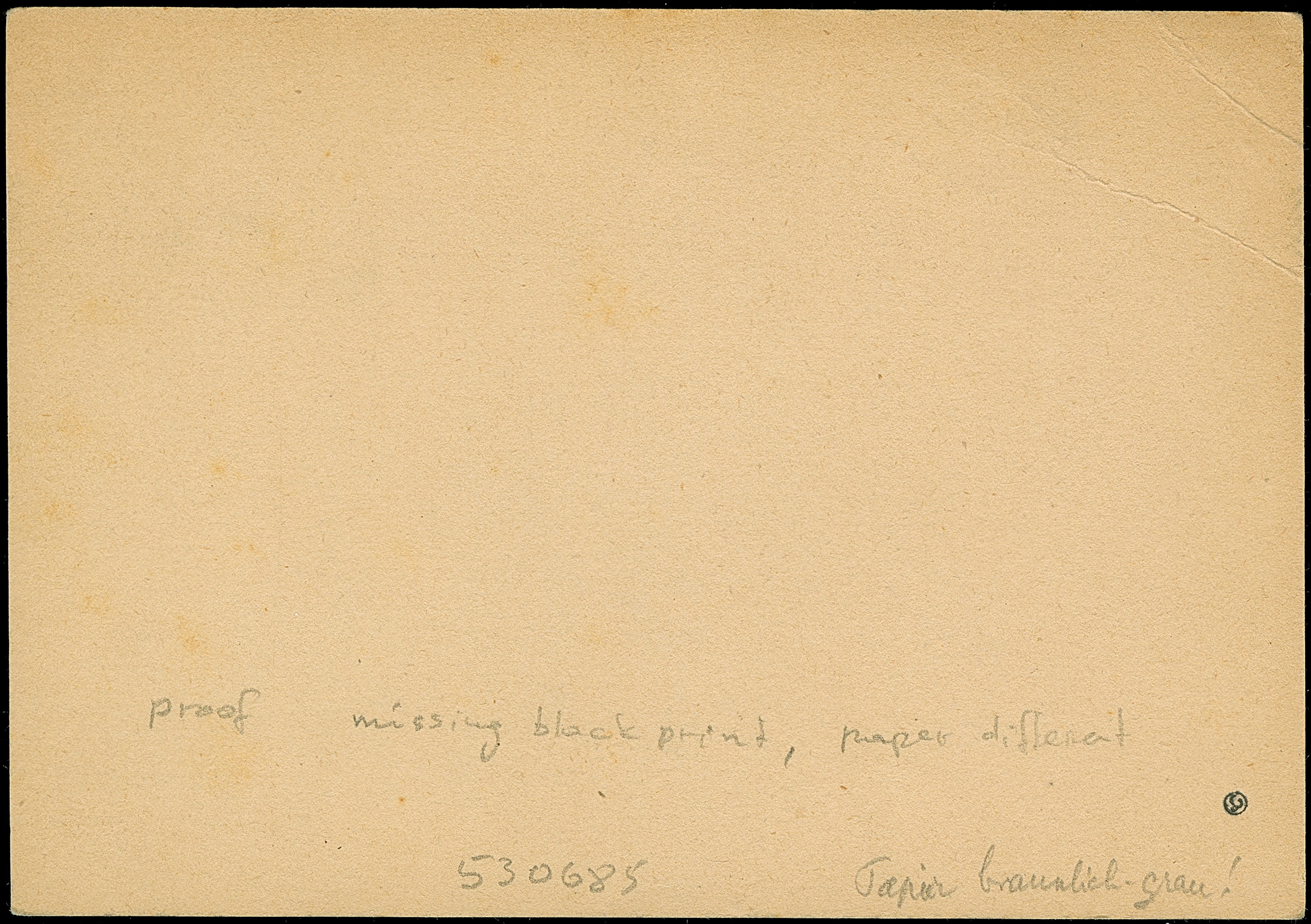 1941, card 1,50 din. as proof without the colour green black, unused with tiny spots and creases at the left upper corner, otherwise fine.rare