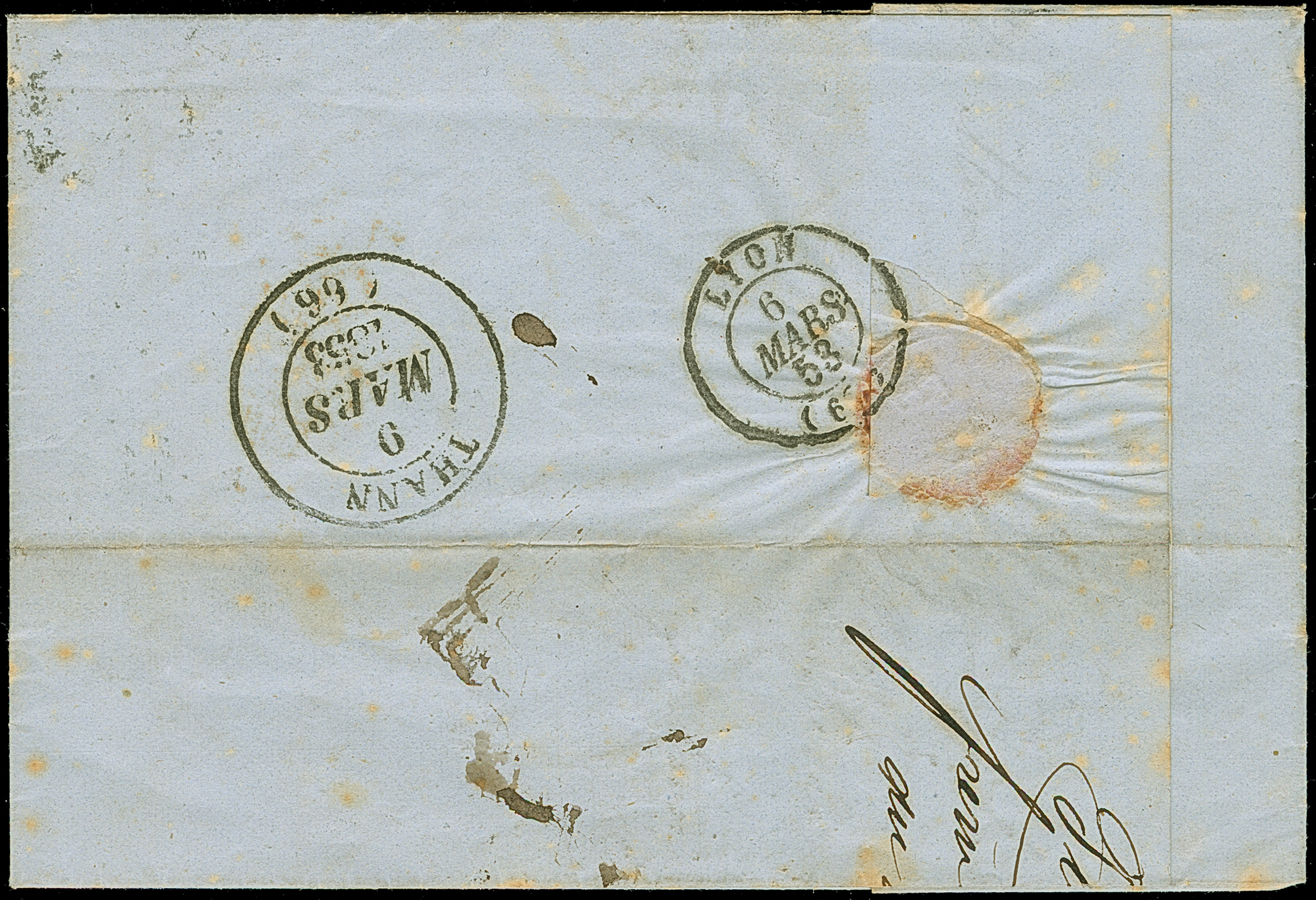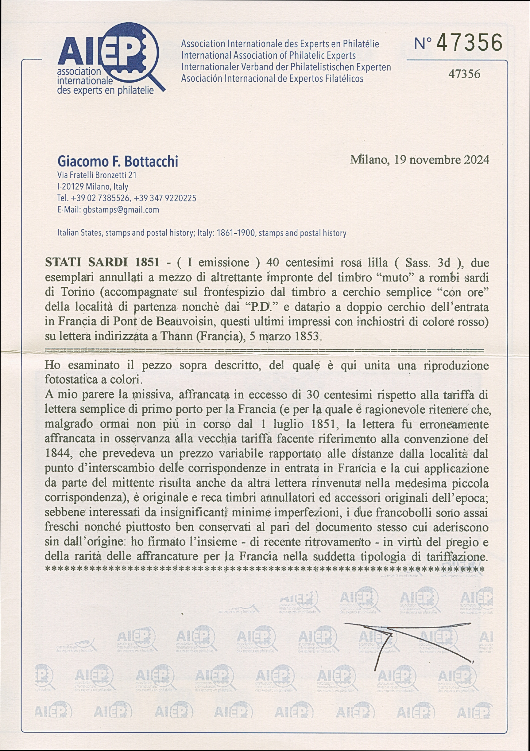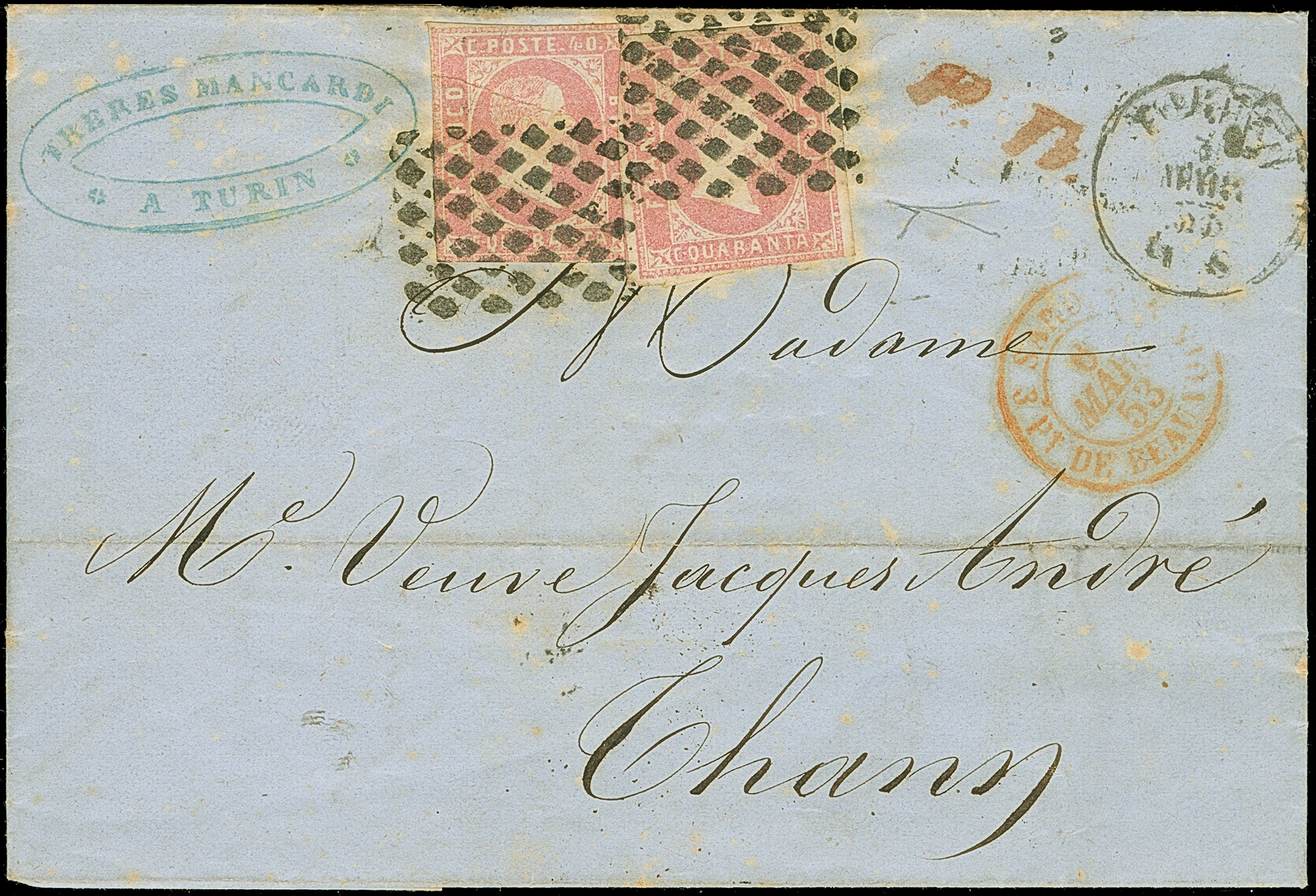 1851, King Emmanuel II 40 c. lilac rose, two fresh examples of this rare shade, margins shaved or touched to large, each tied by mute cancel to folded entire to Thann, France with alongside departure cds. “TORINO”, red “P.D.” and transit cds. “PONT DE BEAUVOISIN 6 MARS 1853”, reverse transit via Lyon and arrival “THANN 9 MARS 1853”. One 40 c. with a strong paper crease, still a fine, very rare and attractive franking, slightly overpaid at the previous 1844 postal convention, certificate Bottacchi AIEP (2024) (Sassone-Nr. 3d)