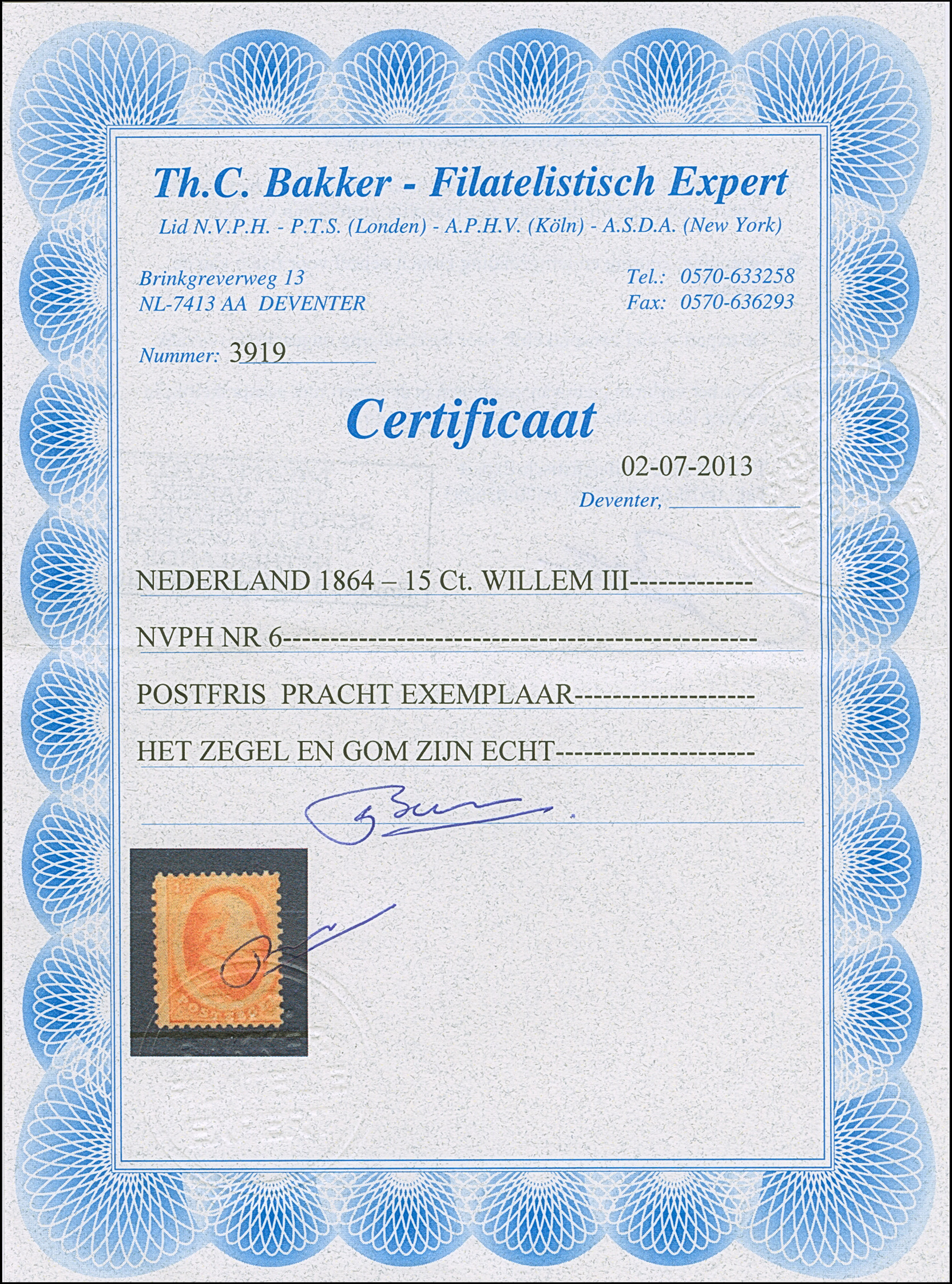 1864, King Wilhelm III. 15 c. orange, light decentered, mint never hinged, fine, unsigned with certificate Bakker (2013)