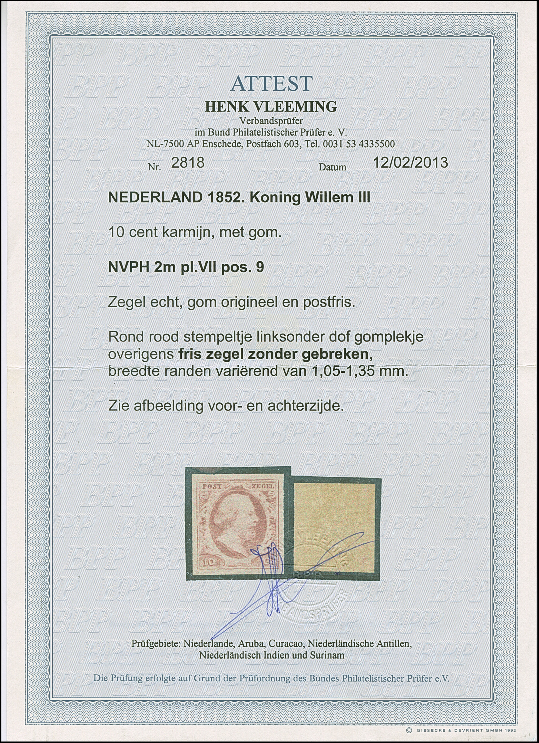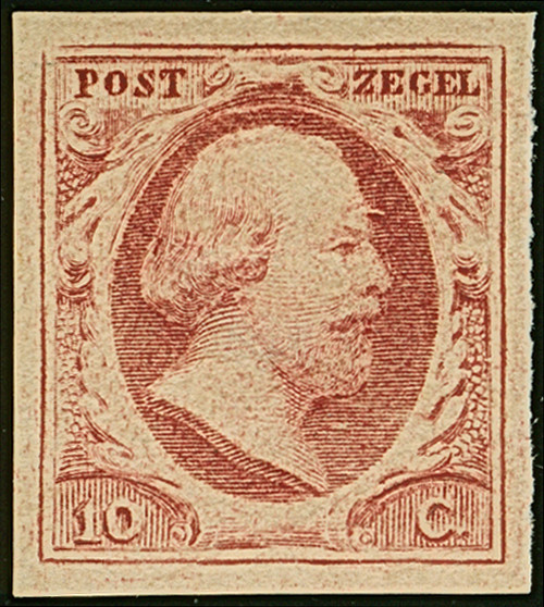 1852, King Wilhelm III. 10 c. carmine, plate VII, position 9, fresh colour and good margins all around, mint never hinged with light tone gum spot with red signature, fine. Mint never hinged Mint never hinged copies of this stamp are very rare, certificate Vleeming BPP (2013)