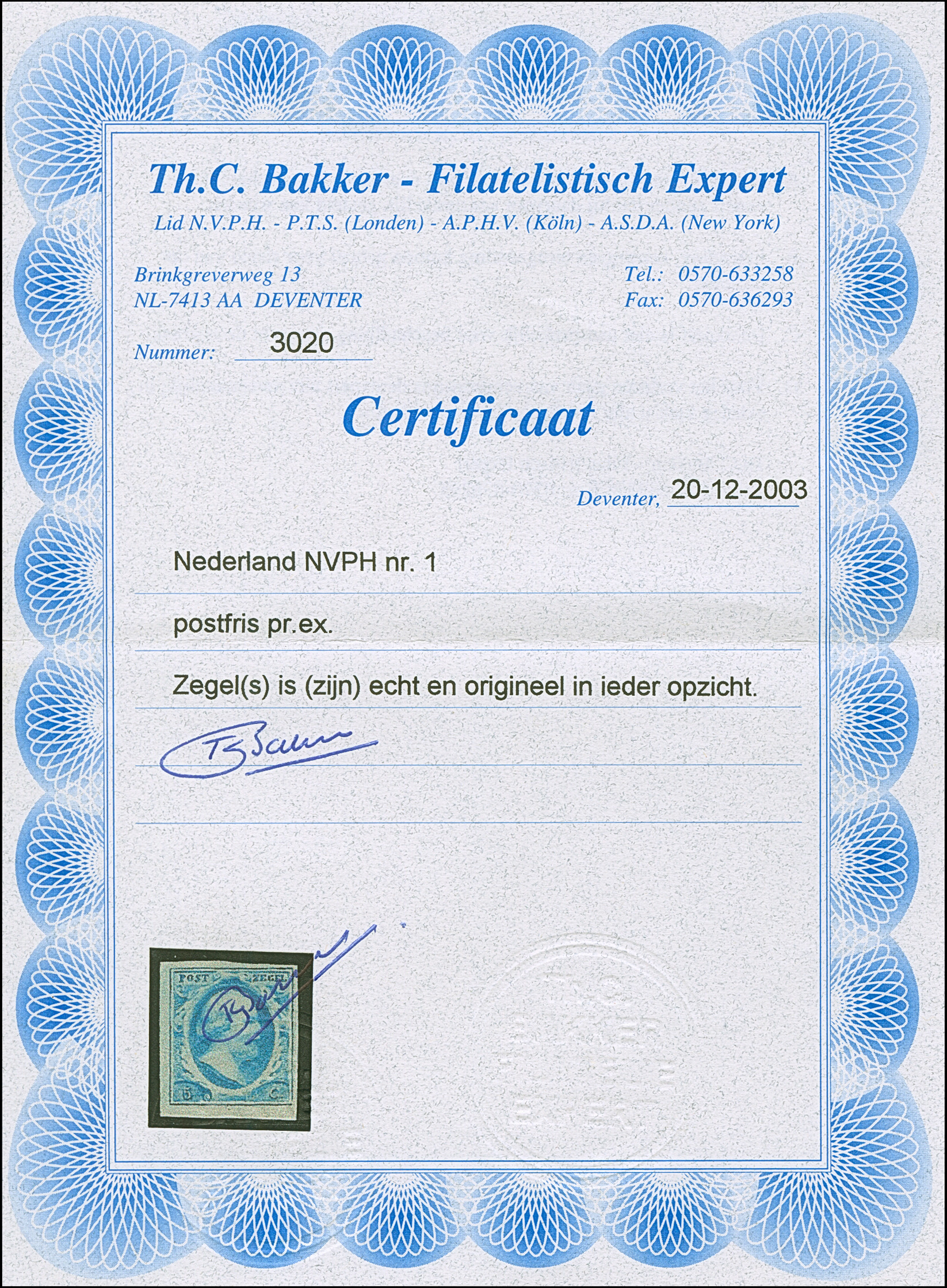 1852, King Wilhelm III. 5 c. pale blue, fresh colour and good to wide margins all around, mint never hinged, fine, unsigned with certificate Bakker (2003)