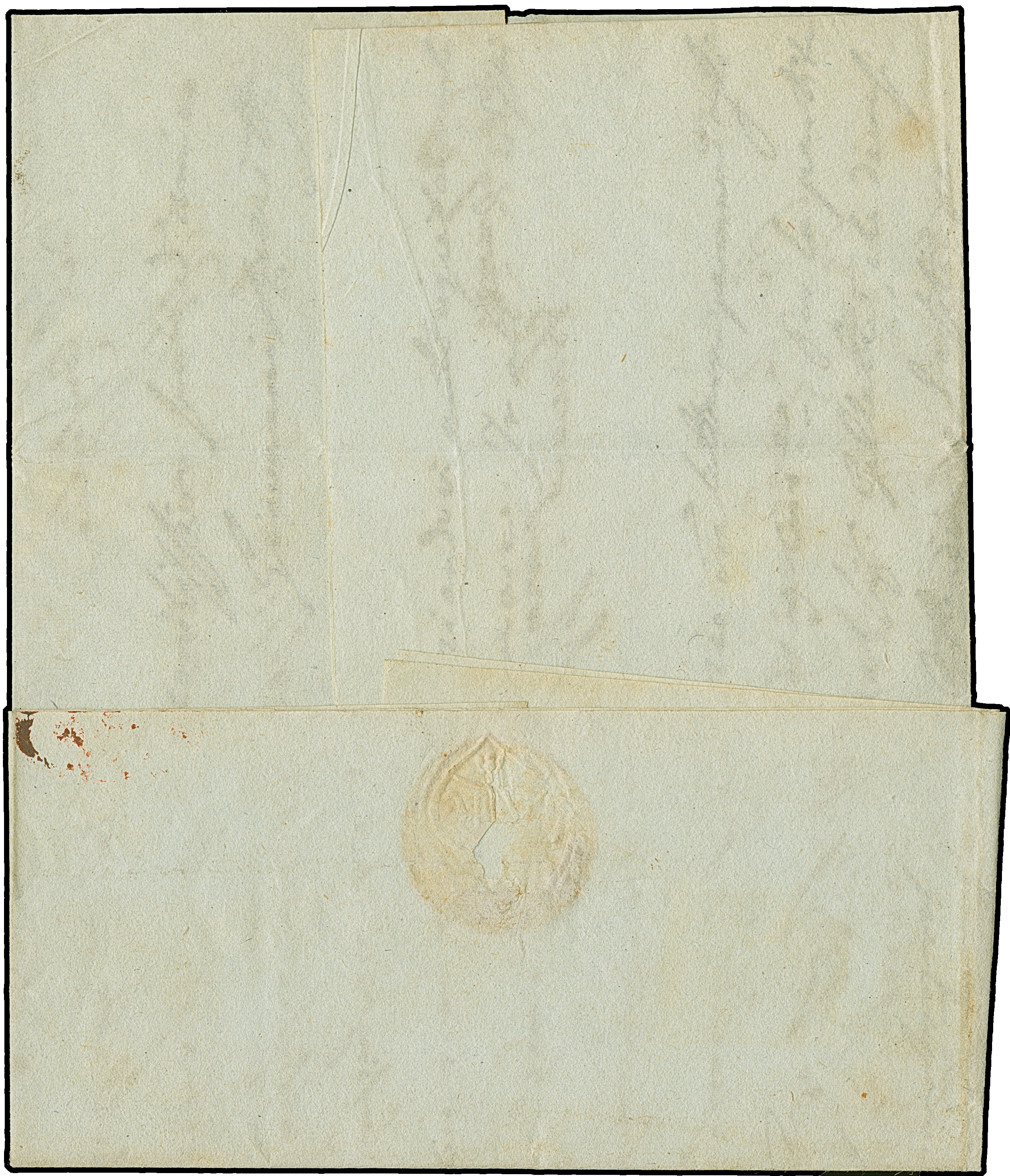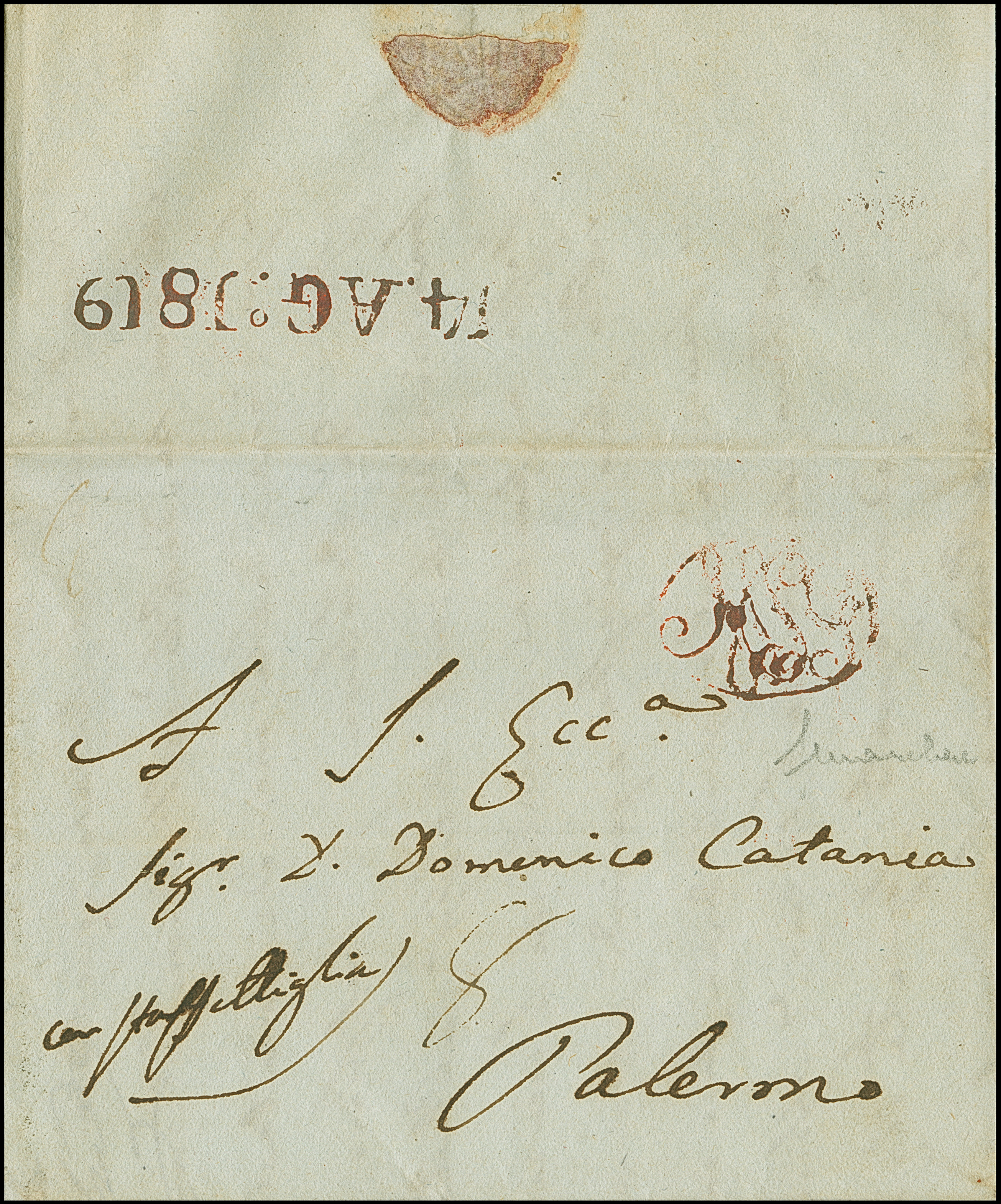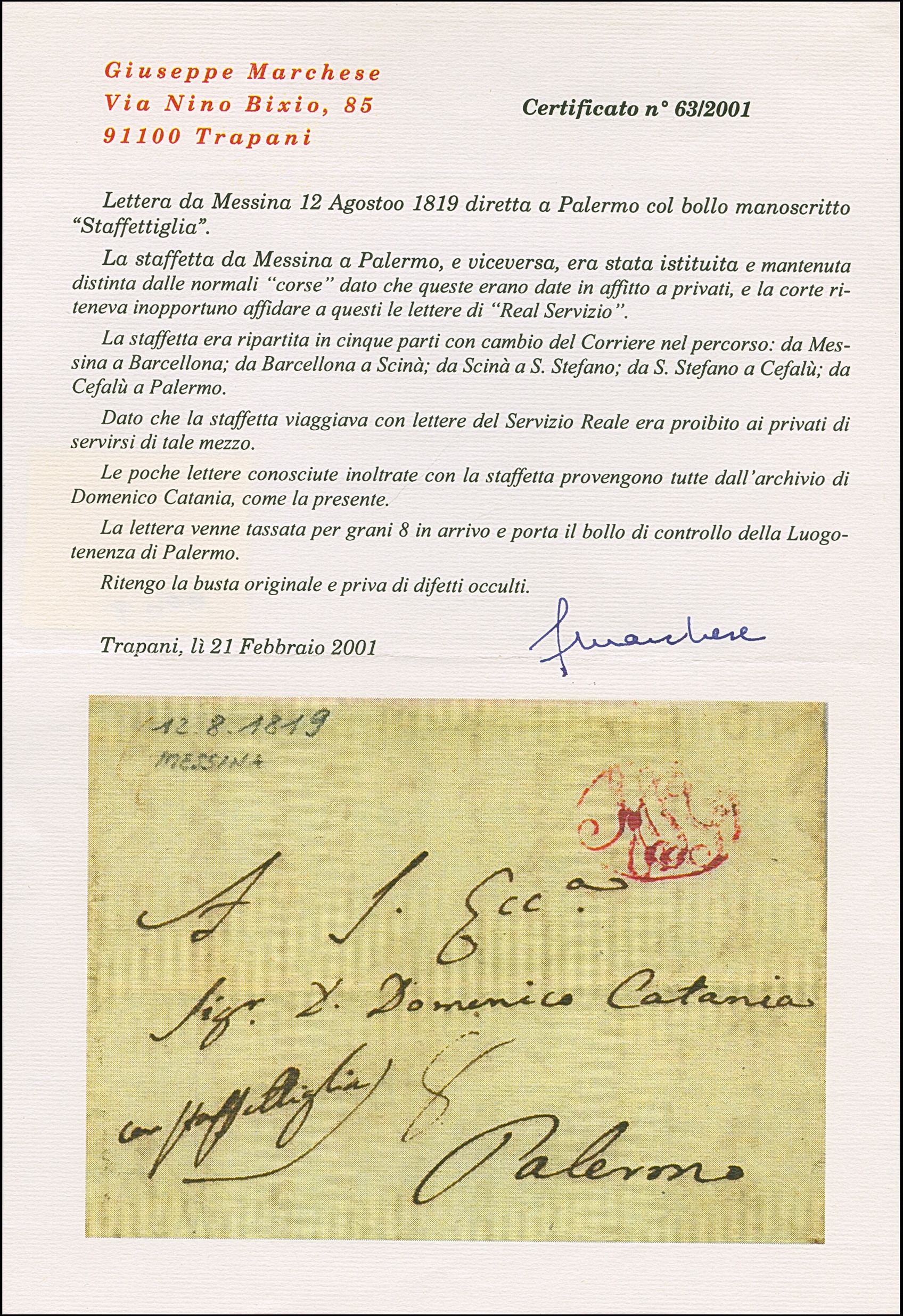 1819, letter sheet from Messina to Palermo, endorsed "con Staffettiglia" and taxed upon arrival with "8" Grana; adjacent control handstamp of the lieutenancy of Palermo. Fine and very scarce.