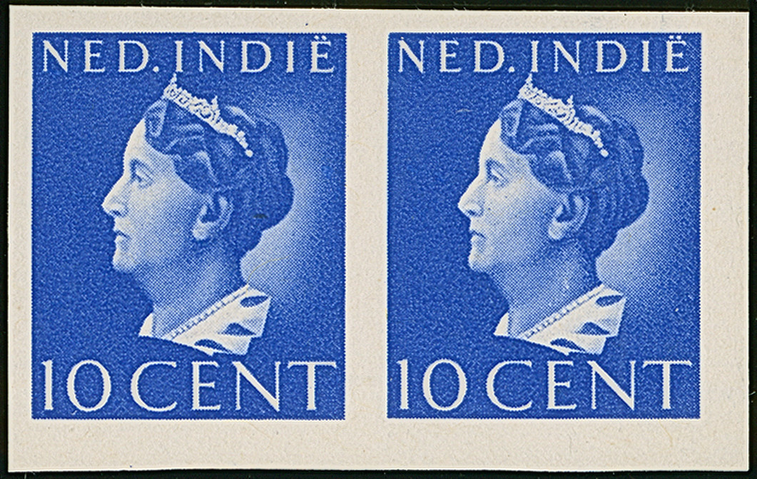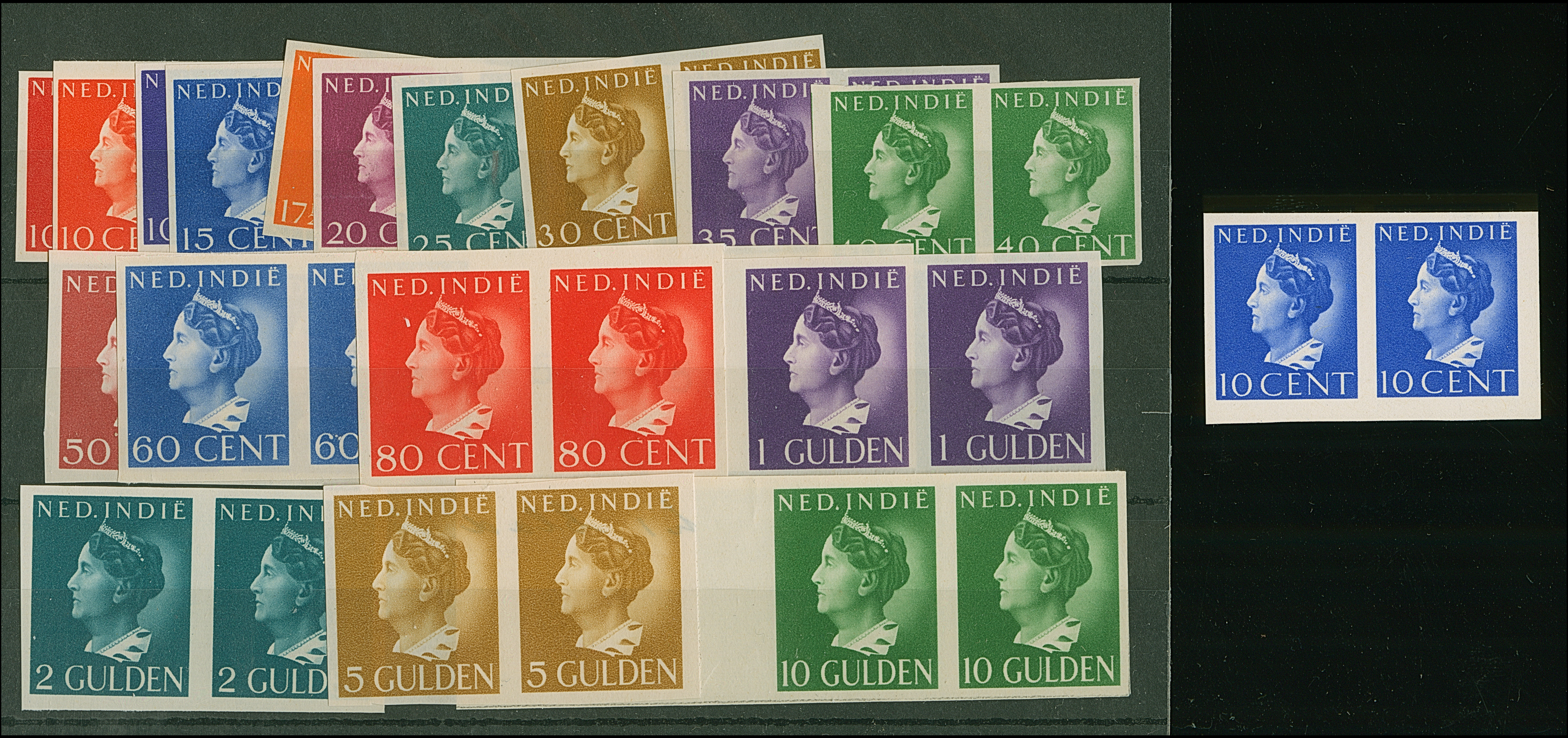 1941, Wilhelmina 10 c. – 10 g. as imperforated proofs, all in horizontal pairs, including 10 c. in 4 different colours