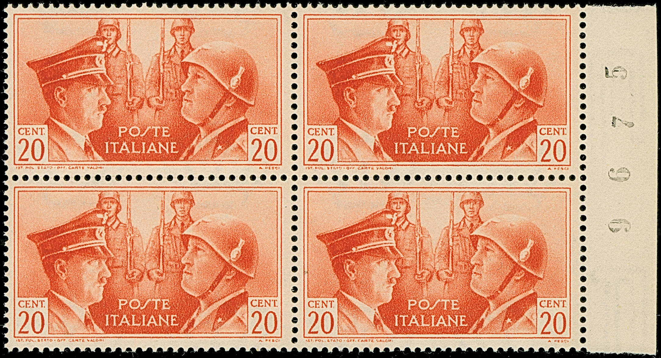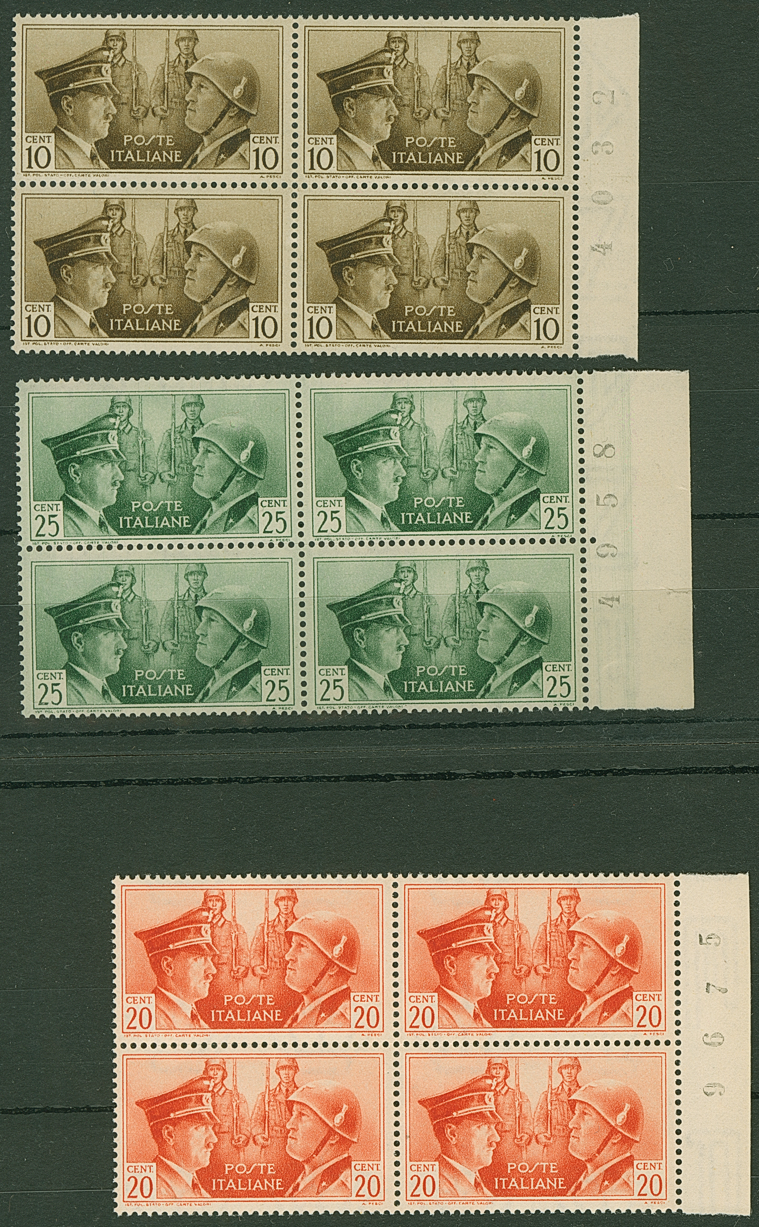 1941, German-Italian Axis unissued 10 c.-25 c., complete in blocks of four with right sheet margin, mint never hinged, the 25 c. tiny tear in the selvedge and one adhesive with disturbed gum, otherwise very fine (Sassone-Nr. 457A-C)