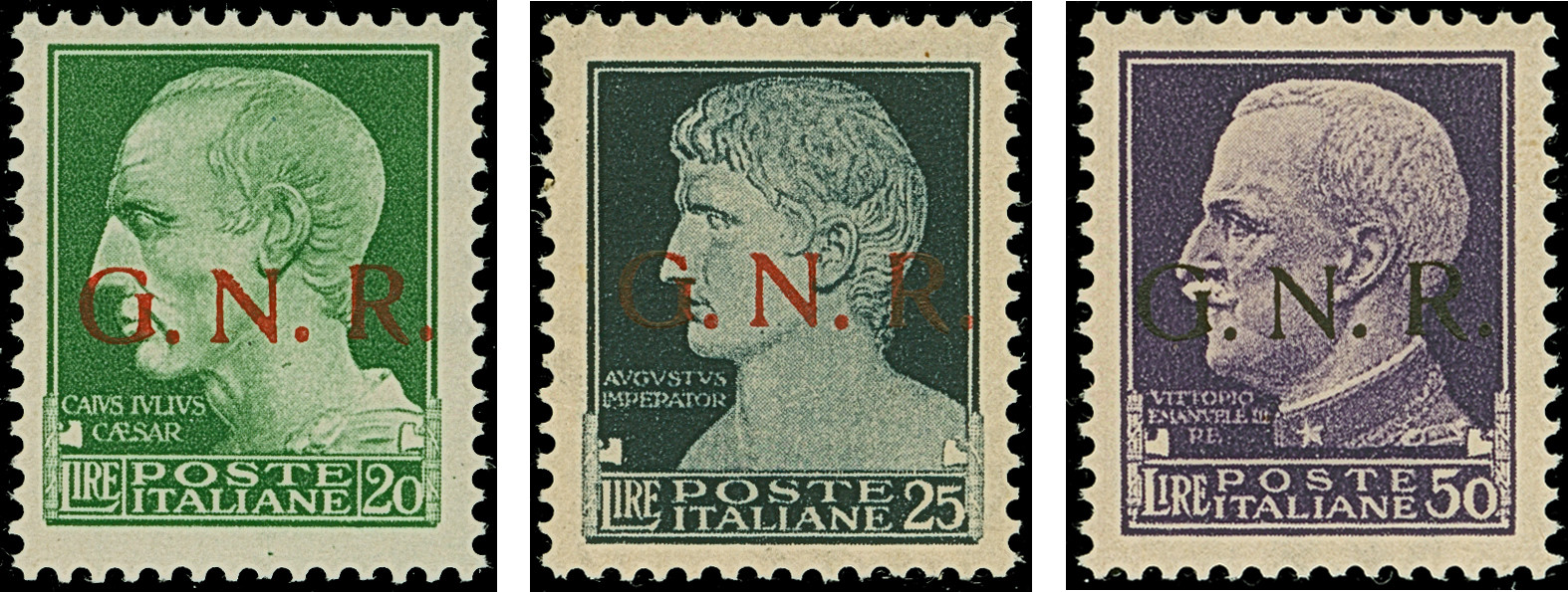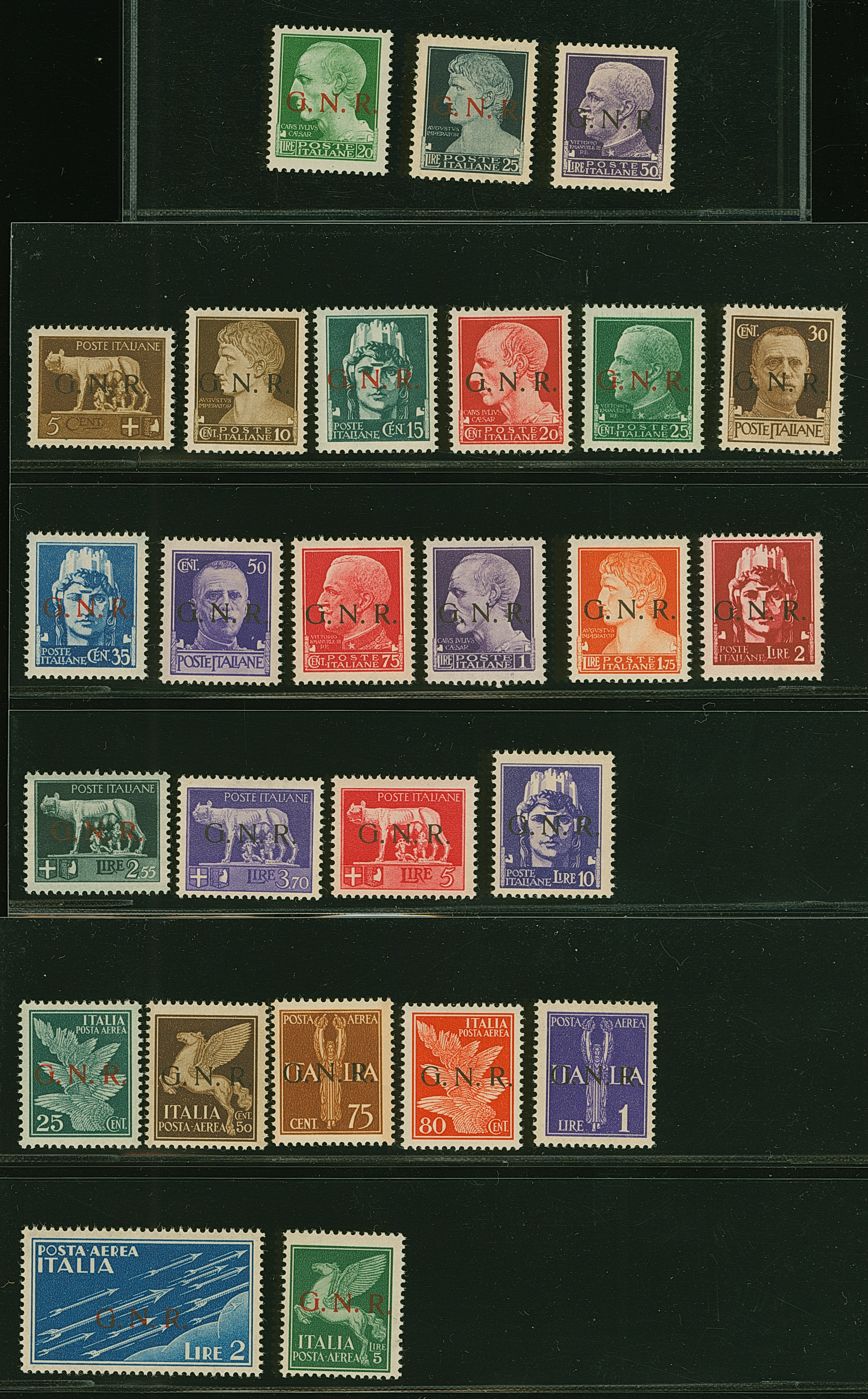 1943, 5 c. -1 l., 1,75-50 l. and airmail 25 c.-5 l. with overprint “G.N.R.”, 26 different stamps, mint never hinged, verfy fine, a.o. sign. Colla with two certificate (2025) for Verona or Brescia prints