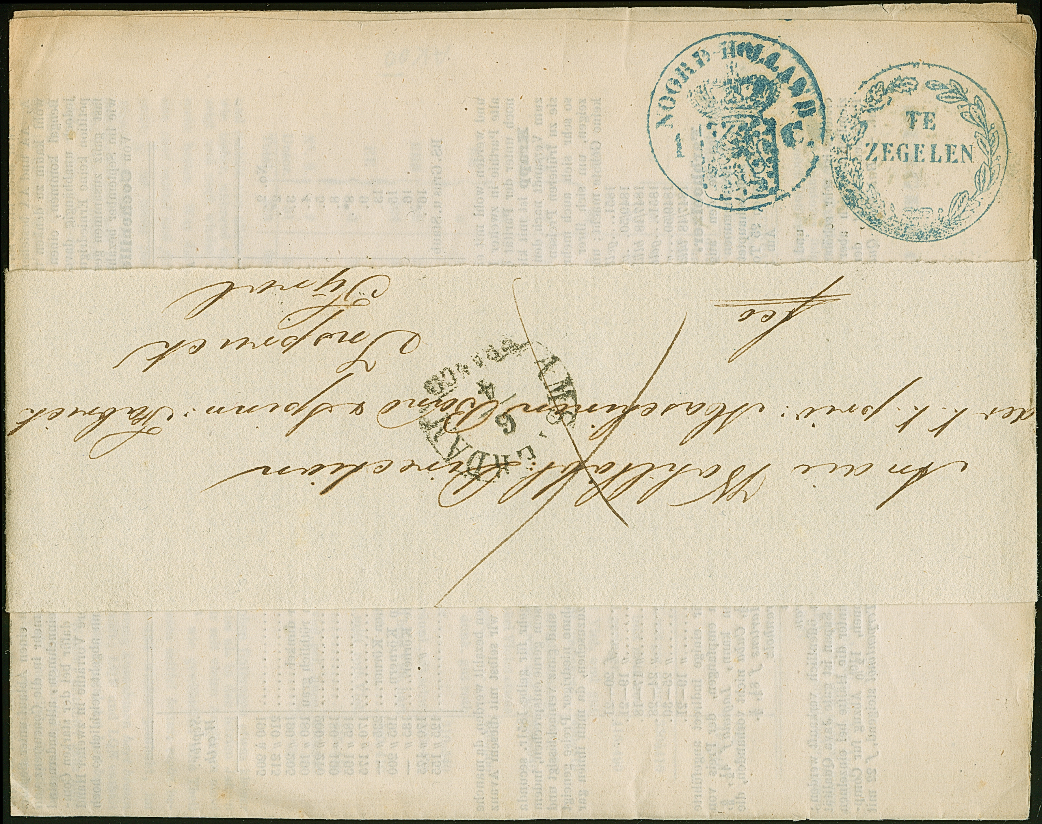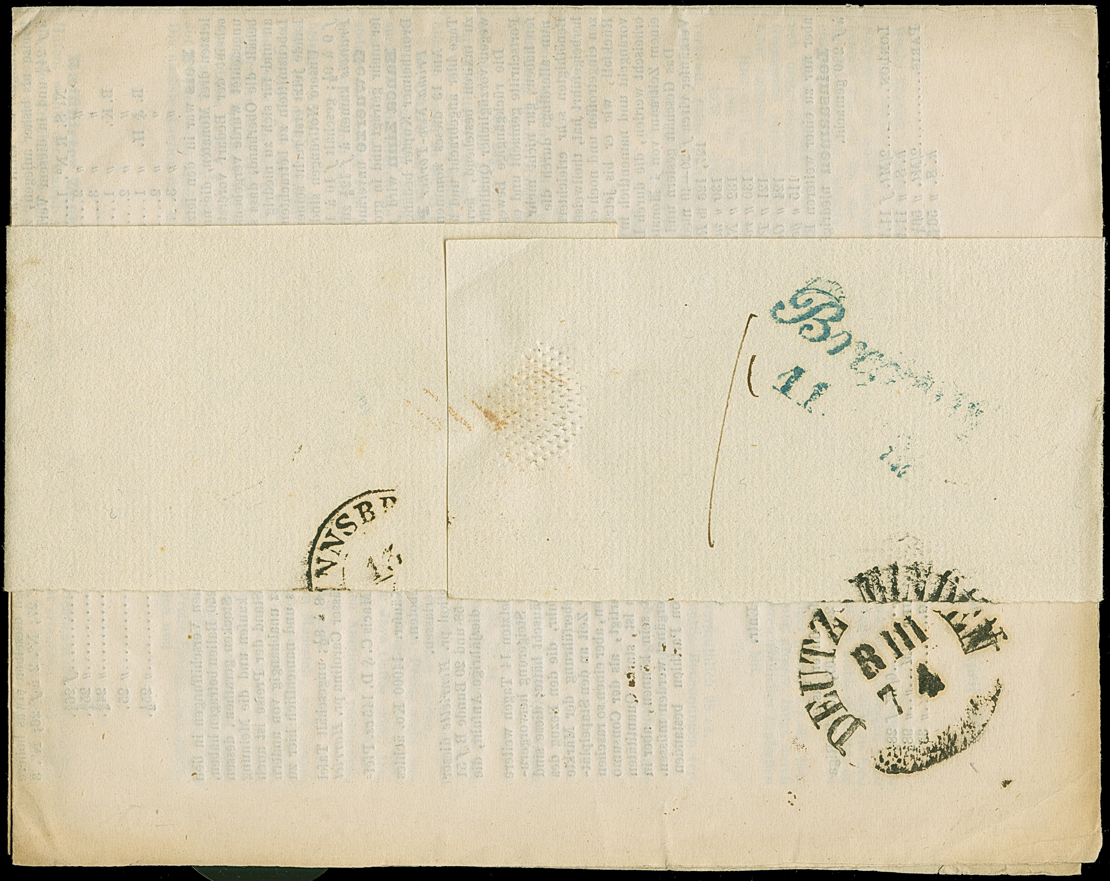 1852, blue fiscal handstamps “TE ZEGELEN” and “NOORD HOLLAND 1 C.” on a complete printed matter and its wrapper, dated inside 7 April 1852, sent to Innsbruck, Tyrol with departure cds. “AMSTERDAM 6-4", reverse railway postmark “DEUTZ-MINDEN 7 4”, two-line “BEGRENZ 11” and arrival Innsbruck, minor peripheral ageing not detracting, very fine and very scarce