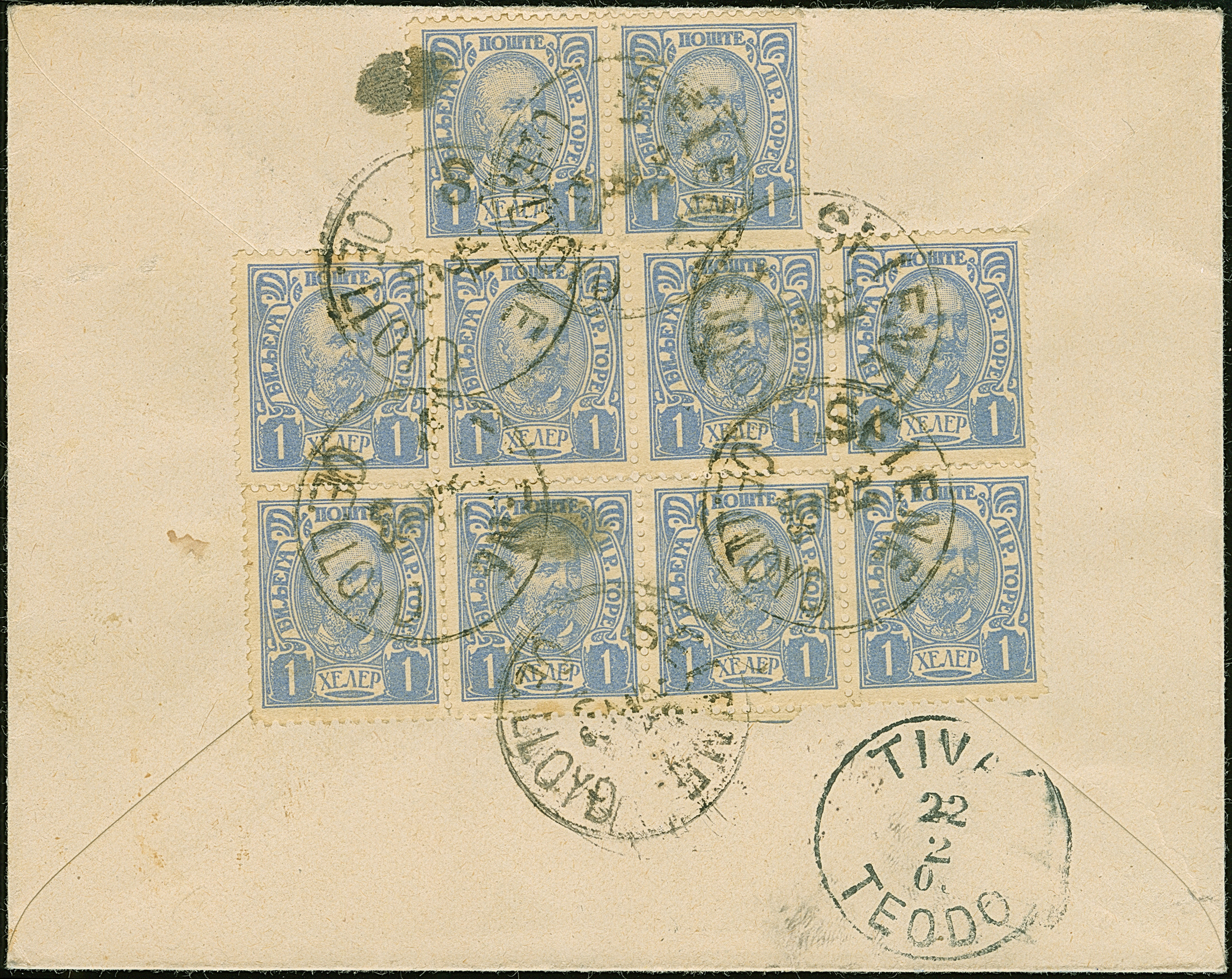 1902, Prince Nikola I. 1 h. ultramarine, block of 8 and horizontal pair each tied by Austria ship mark “SELENE IE LLOYD 21.2.03” to reverse on cover to Teodo with arrival mark, fine