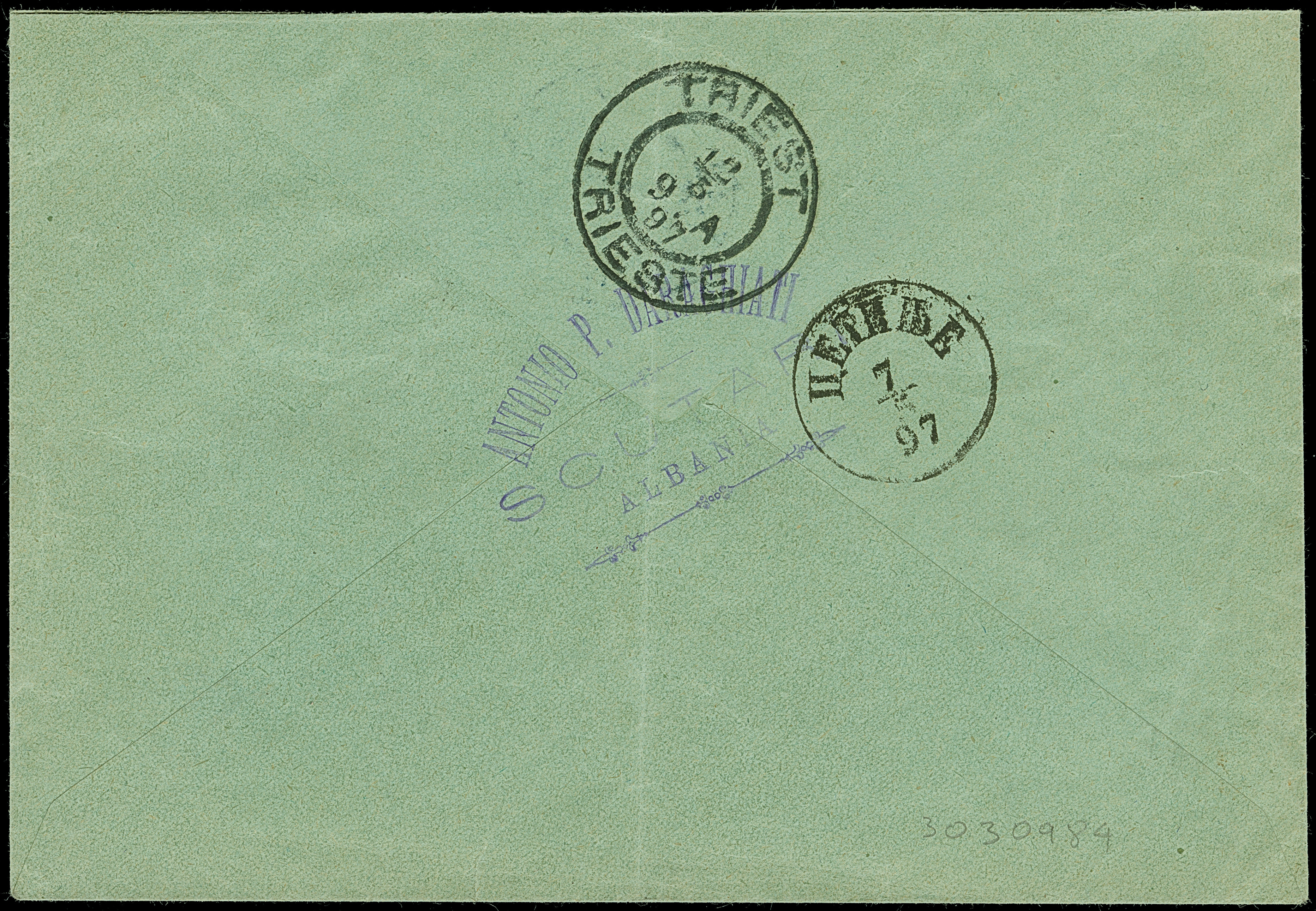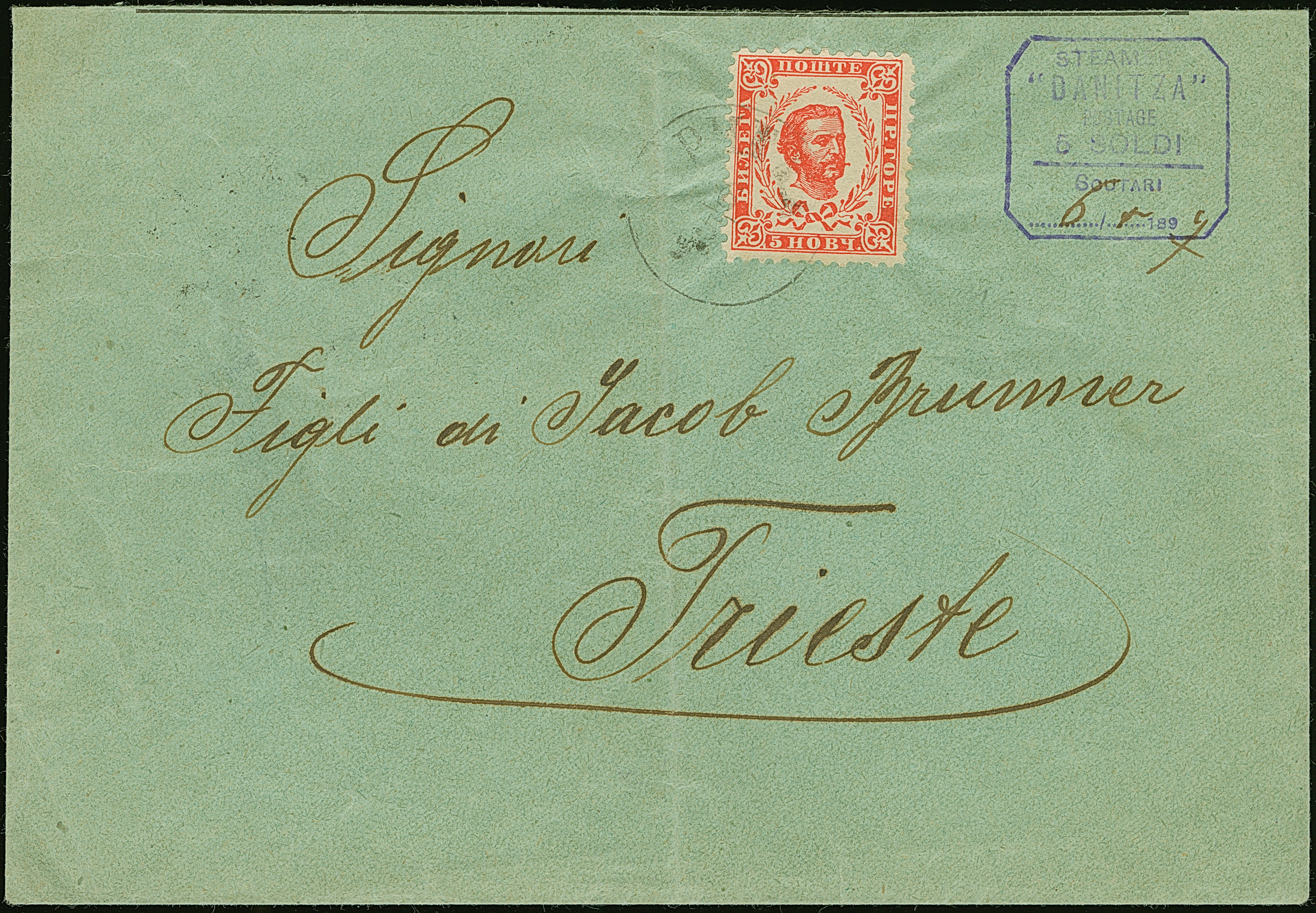1893, Prince Nikola I. 5 nkr. rose-red tied by cds. “RUMA 6.5.” to cover with violet octagon ship mark “STEAMER DANNITZA POSTAGE 5 SOLDI SOUTARI (6)/(5)189(7)” to Triest with arrival Mark. Cover vertical folded and shortened at top, otherwise fine. A very rare ship mail cover of the Skutarisea