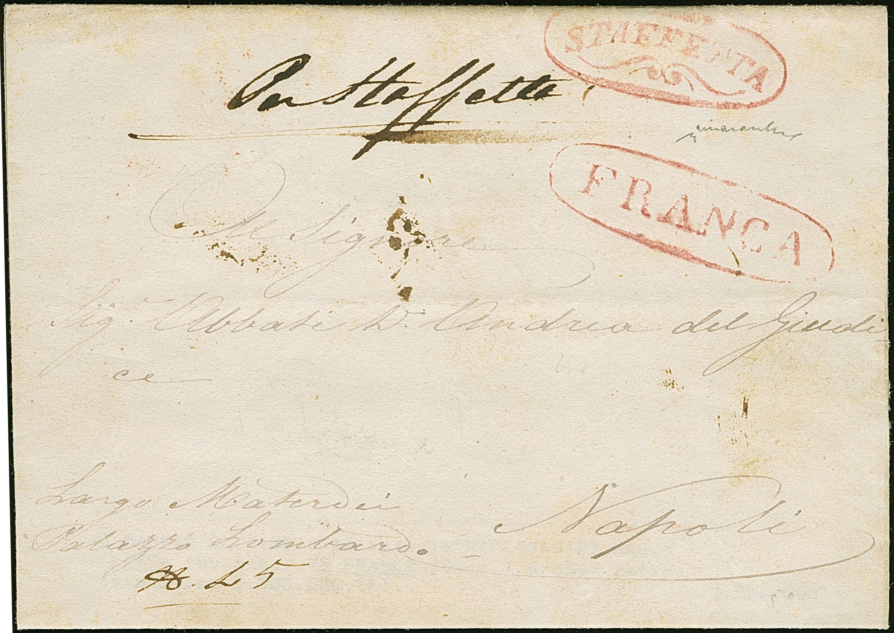 1840, "STAFFETTA", oval handstamp in red, with adjacent "FRANCA" on letter sheet from Palermo to Naples, with red dispatch- and arrival marks on reverse. Fee of "20" Grana noted on reverse. Fine and scarce.