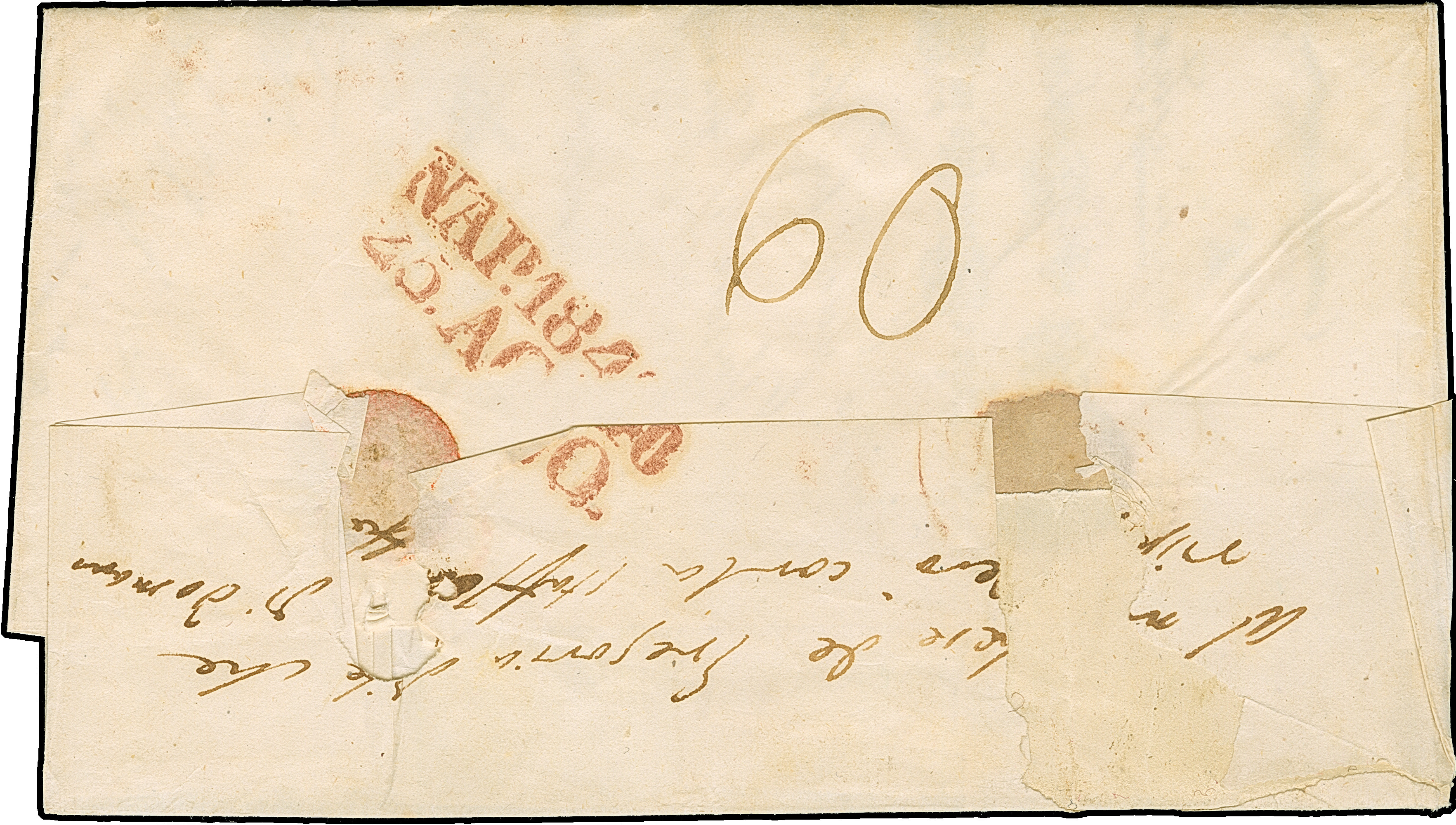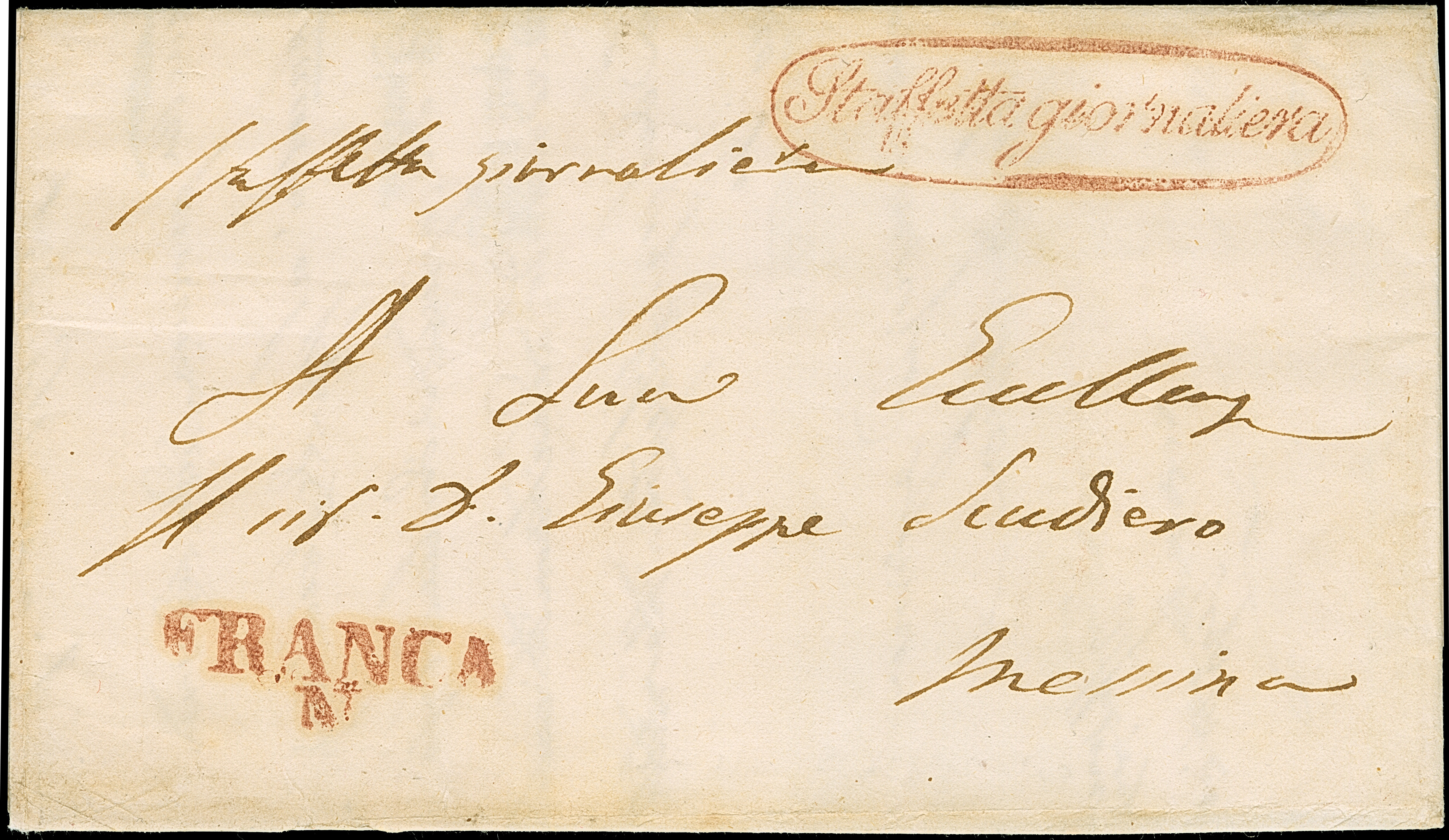 1840, "Stafetta giornaliera", oval handstamp in red, with adjacent "FRANCA N" on letter sheet from Naples to Messina, with red dispatch mark and manuscript fee of "60" Grana on reverse. Fine and scarce.