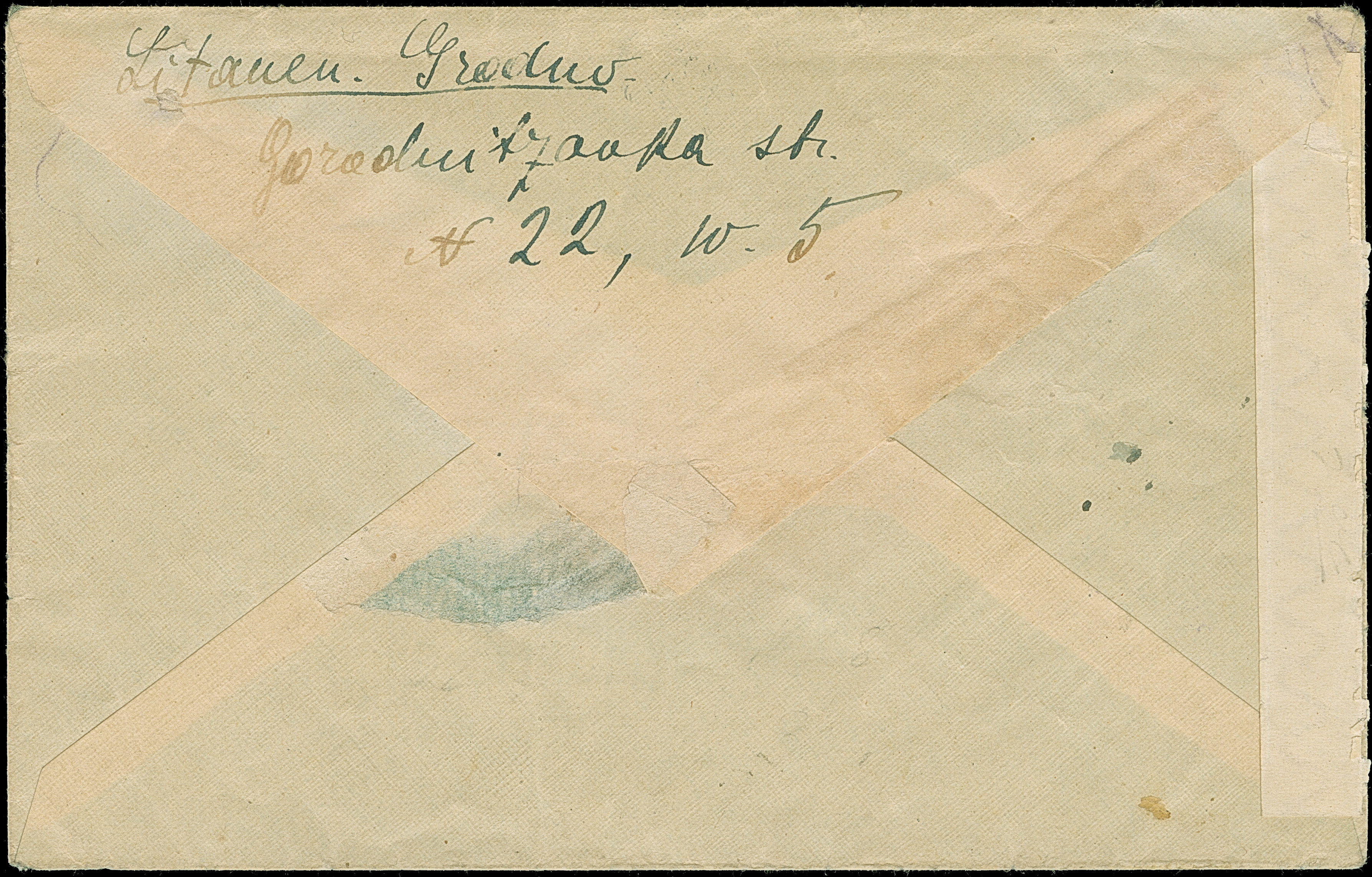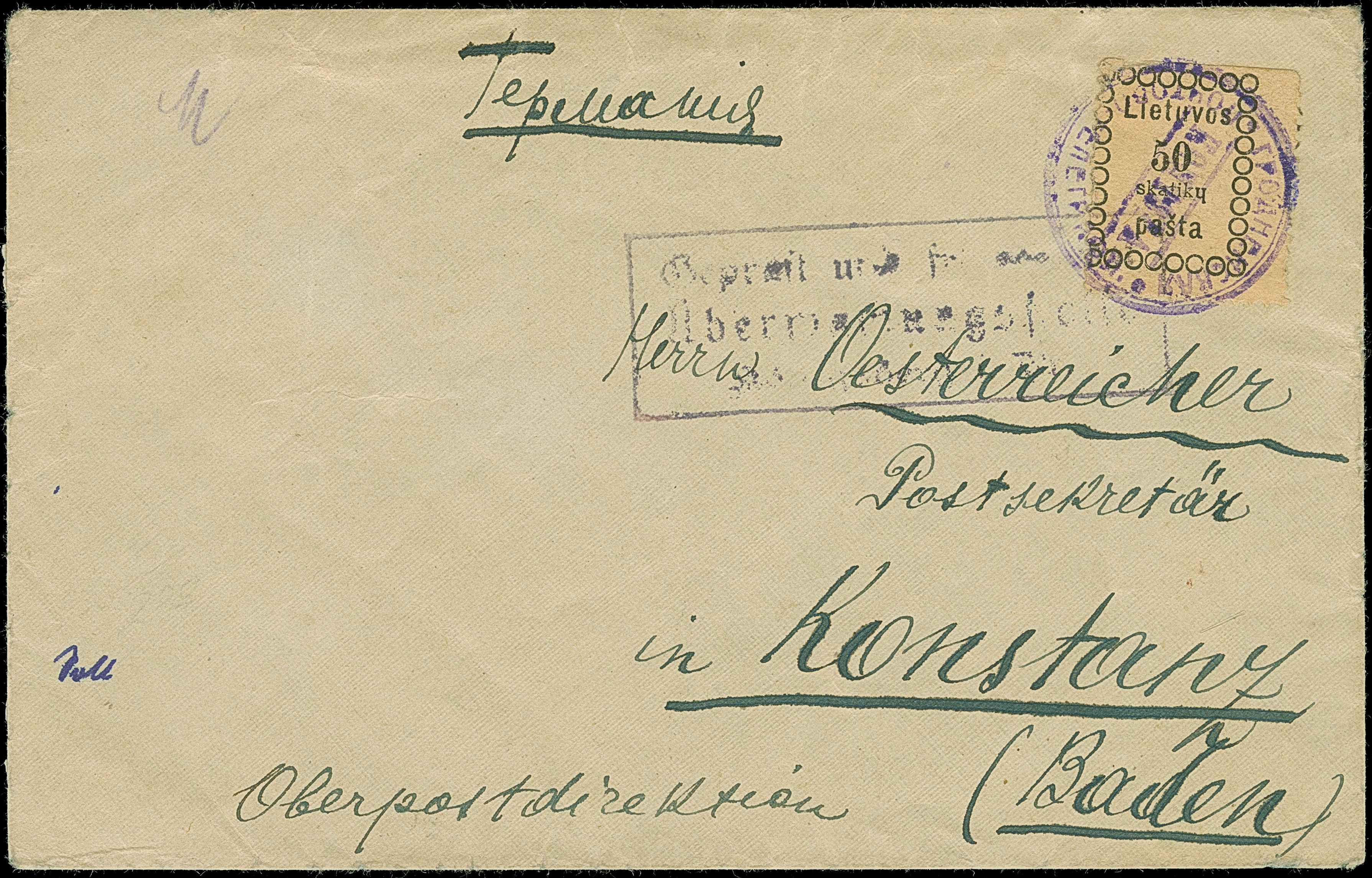 1919, Second Vilnius Issue 50 skatiku, tied by violet cancel of “GRODNO” to cover addressed to Konstanz with censor marks “M.P.K.” and further boxed censor mark tying the stamp, fine and scarce