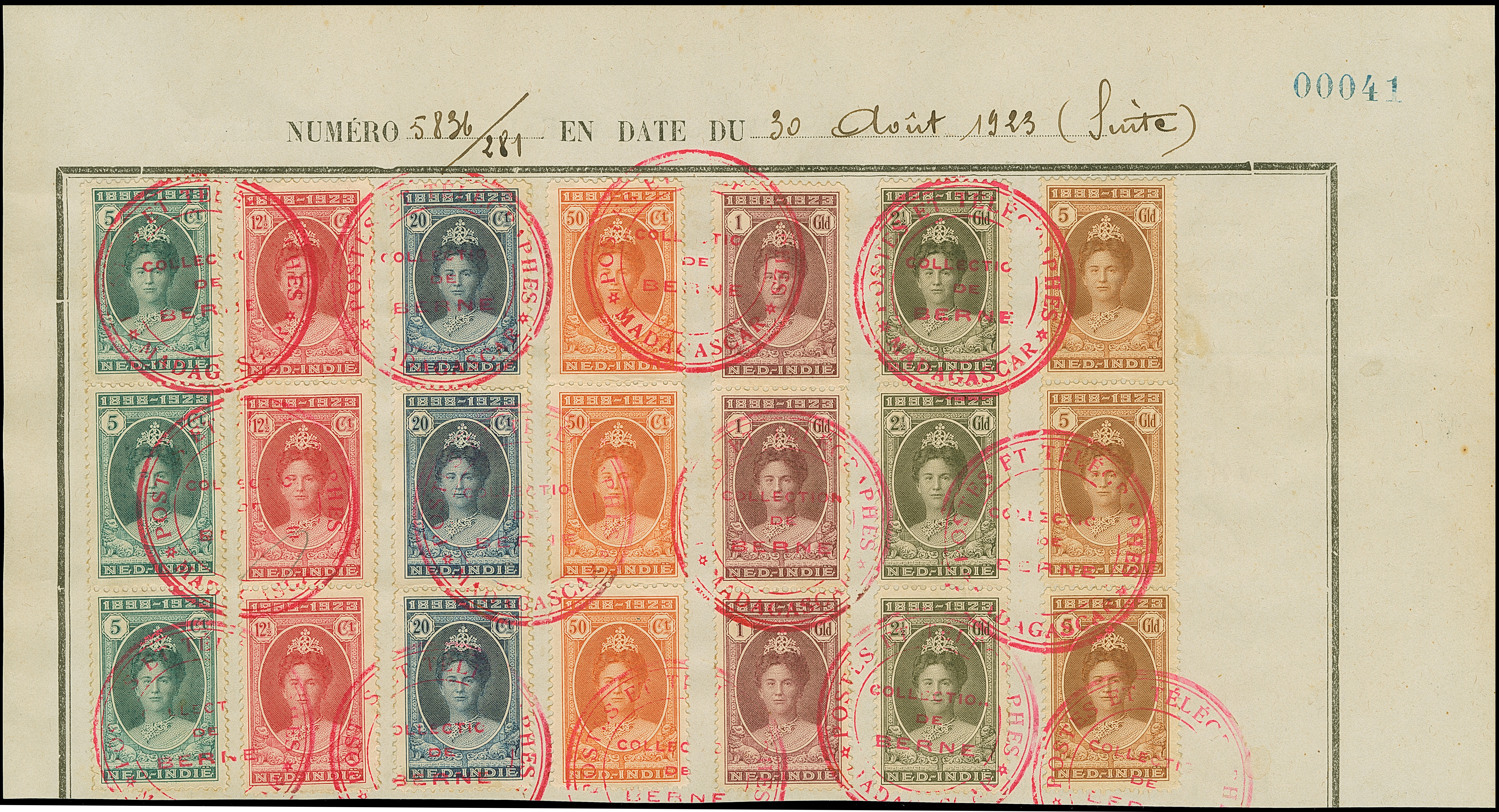 1923, Queen Wilhelmina Silver Jubilee 5c.-5g., each as strip of three affixed to part of archive page, with handstamps “POSTET ET TELEGRAPHES / MADAGASCAR / COLLECTION / DE BERNE” in red, unique