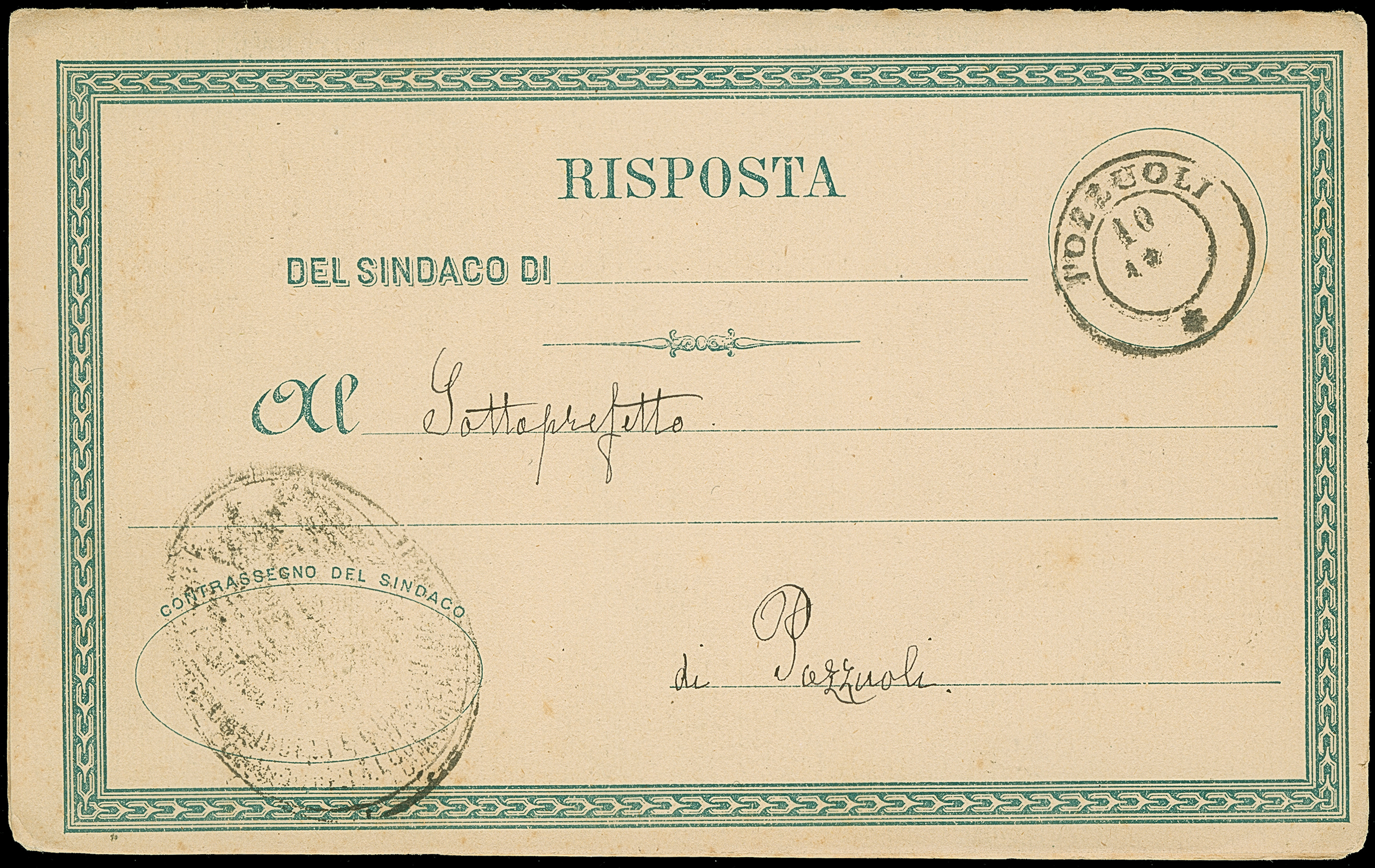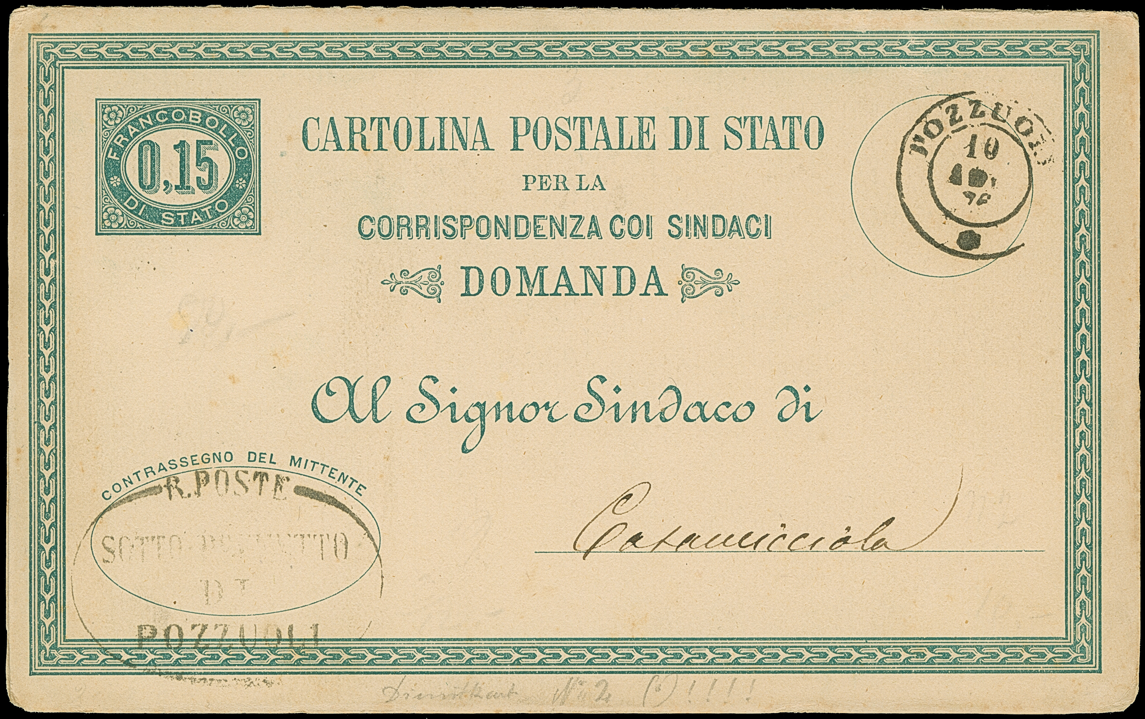 1875, official double card 15l., used back and forth with cds. “POZZOULI 10 … 76” with text, toned and transportation wear, the card was intended for postal correspondence with mayors