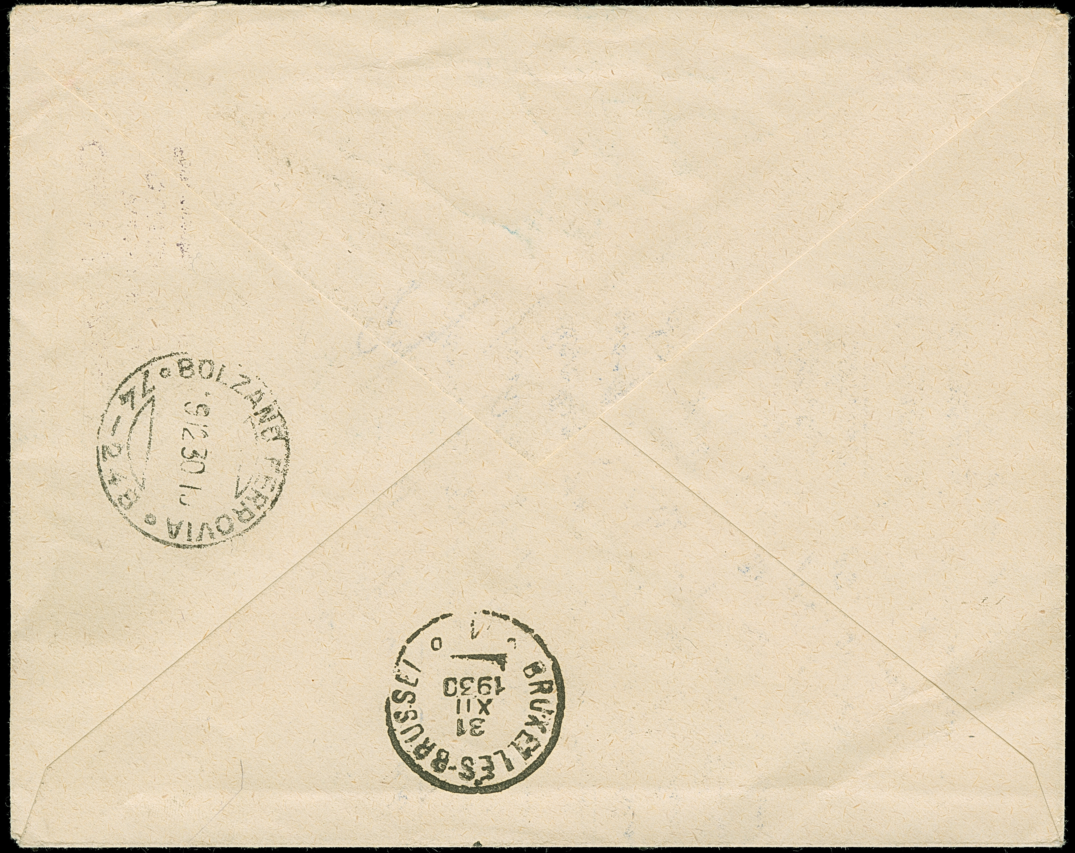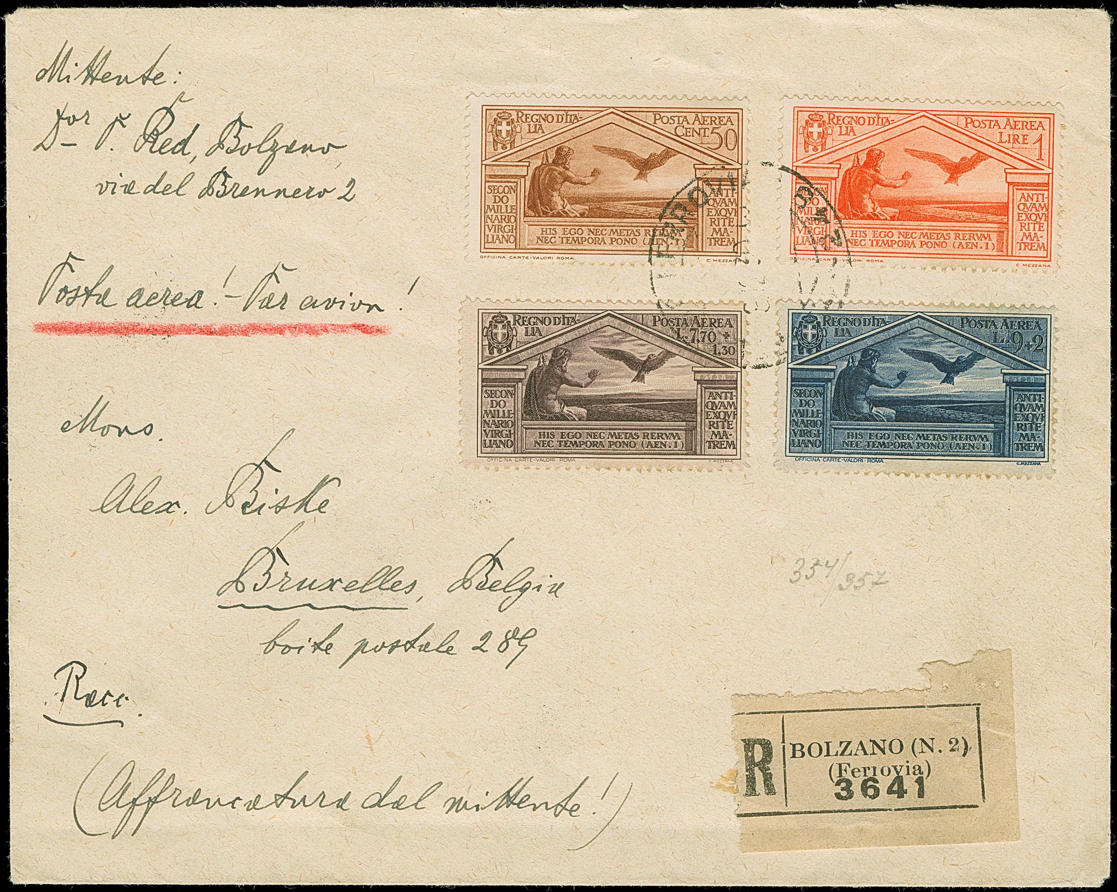 1930, Vergil 50 c.-9 l. cpl. on registered airmail cover with cds. BOLZANO FERROVIA 9.12.30" to Brussels with receiving cds., fine, scarce