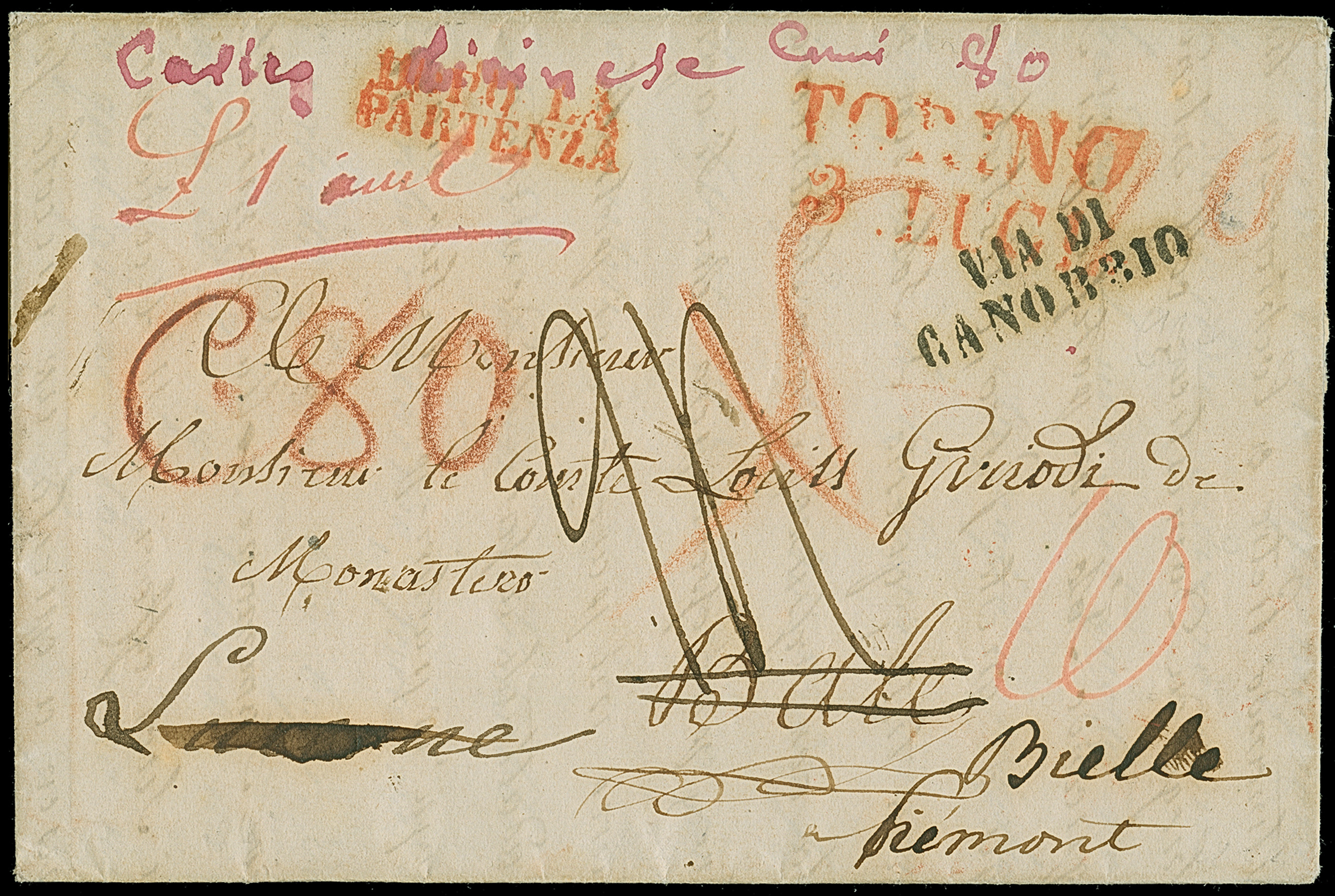 1847, “TORINO 3. LUG” on folded letter forwarded to Bäle and again to Biella (Piemont), with black “VIA DI GANOBBIO”, red “DOPO LA PARTEZA”, the swiss post noted a credit of “80” c., in Canobio they noted “Carcio ticinese Cmi 80”, scarce