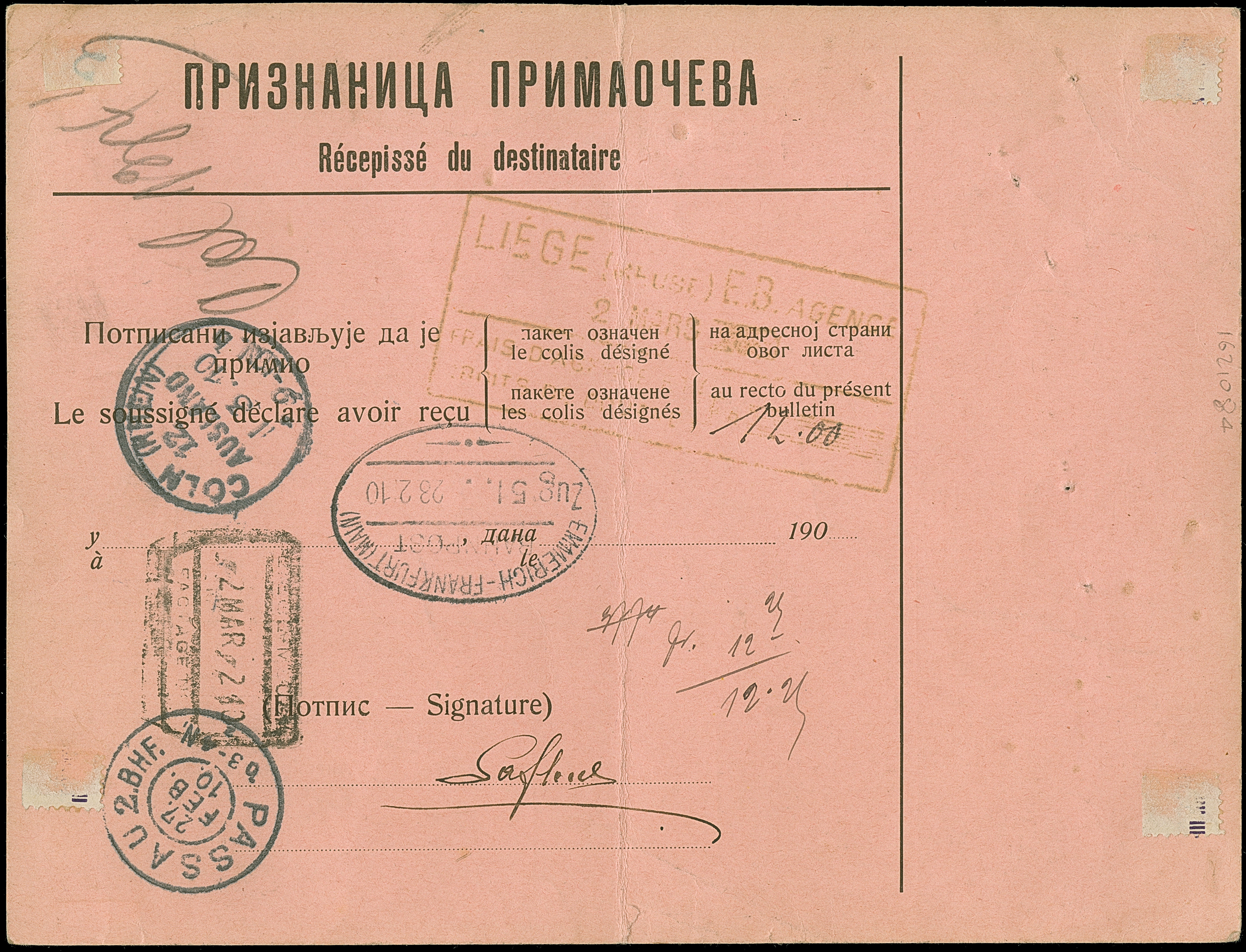 1907, Prince Nikola I. 50 pa. violet, two single stamps tied by cds. “PODGORITZA 22.II.1900” to complete parcel card via Passau and Cologne to Liege, Belgium with arrival mark. The lower stamp with cut in at right und the parcel card are vertical folded, otherwise fine