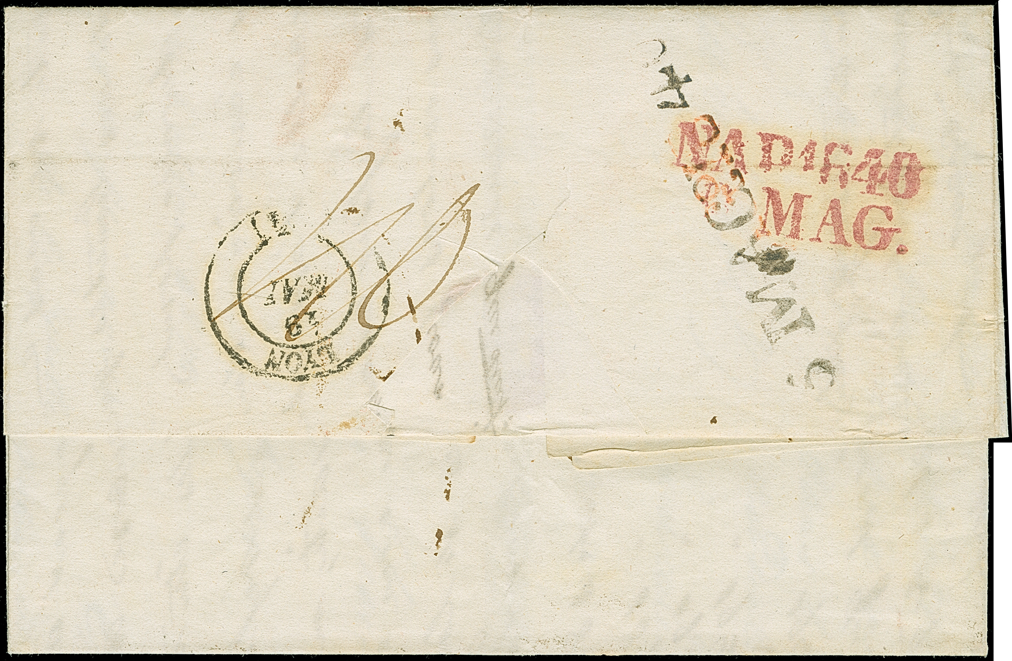 1840, "STAFFETTA GIONNALIERA", clear oval handstamp with adjacent straight line "MESSINA", on entire letter, dated inside "5 Mai 1840", via Naples to Lyon, France, with arrival mark. "40" Grana payment noted on reverse. A rare letter of the short lived express service.