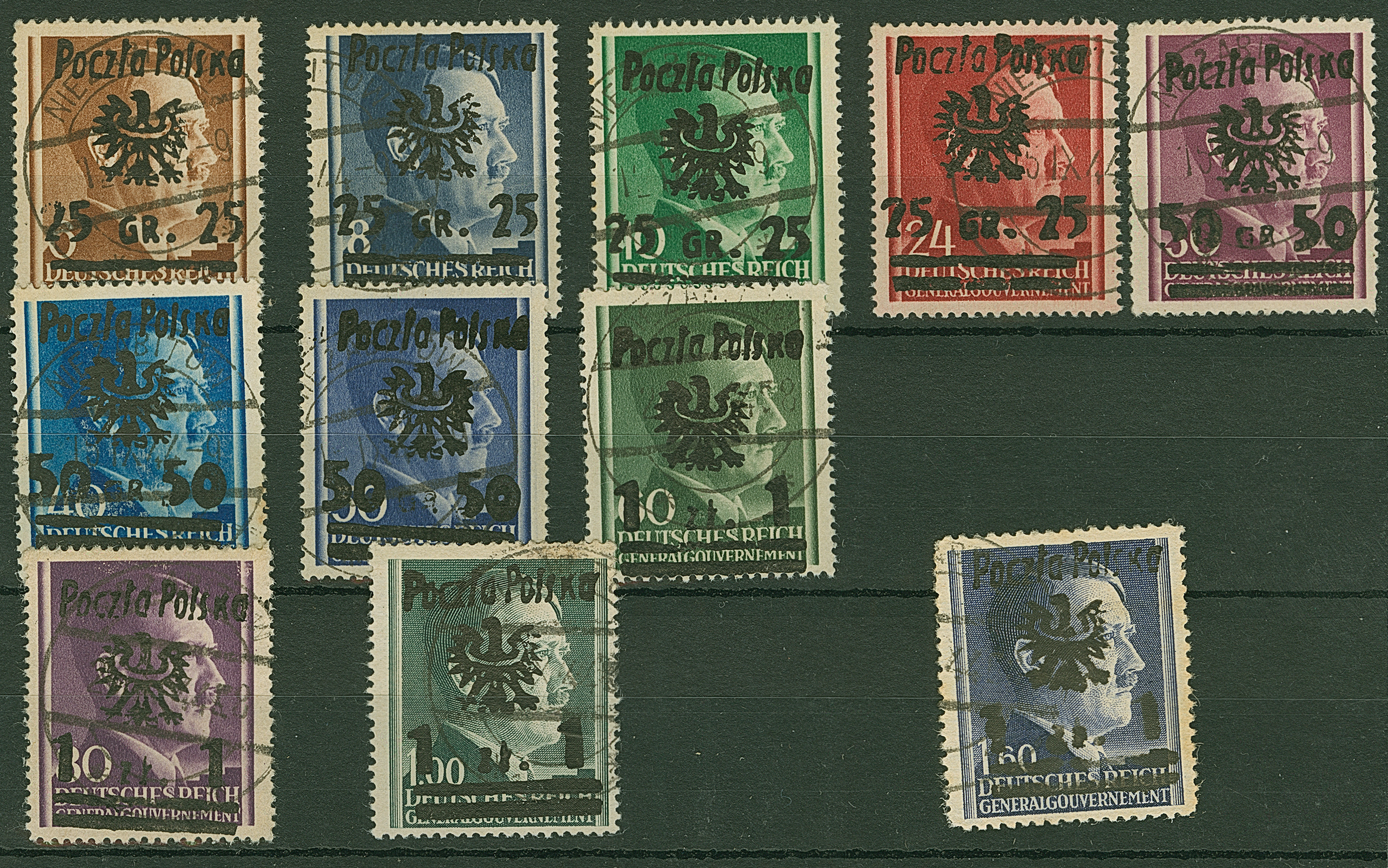 1944, 25 Groszy - 1 Zloty on Hitler, 11 values, all used, mostly fine, signed Krawczyk