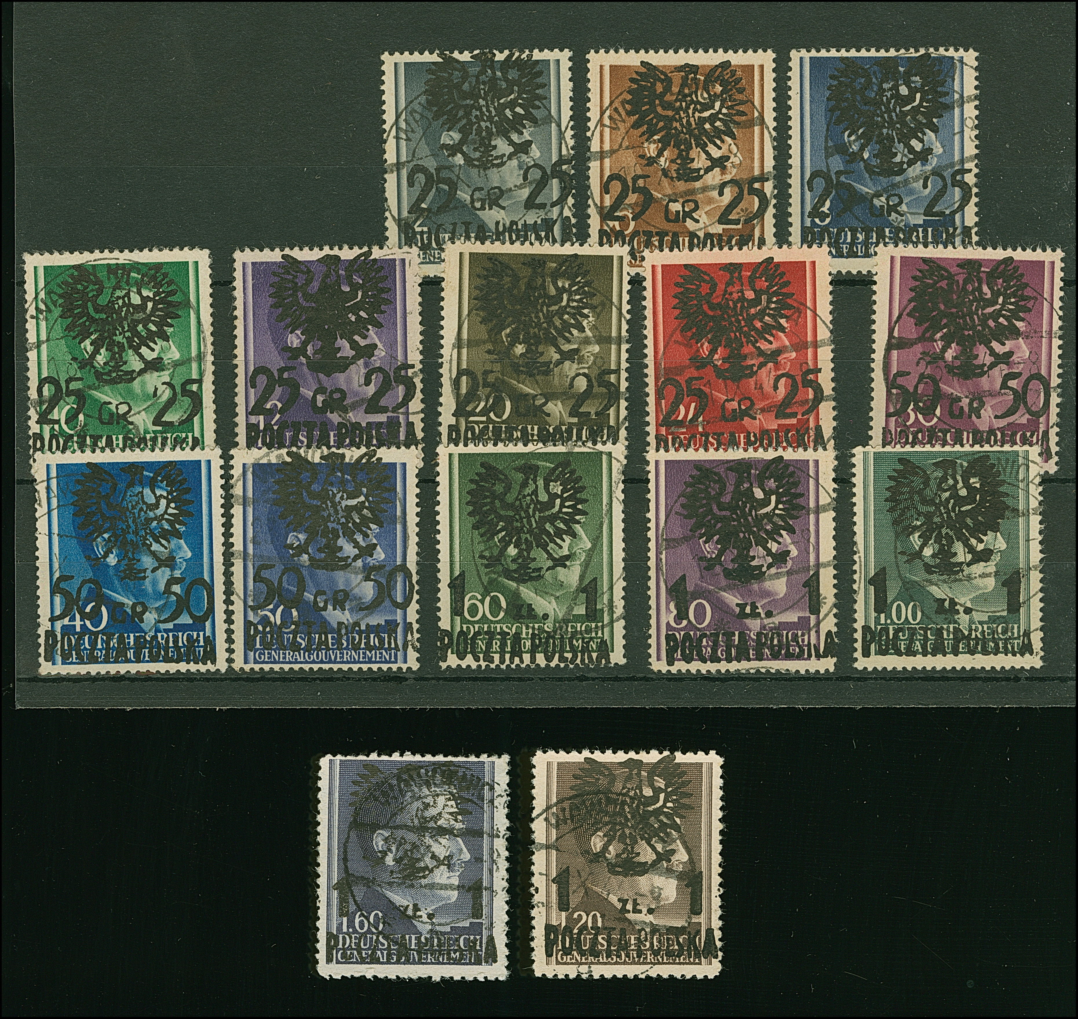 1944, 25 Groszy - 1 Zloty on Hitler, 15 values, all used, mostly fine, mostly signed Jungjohann BPP