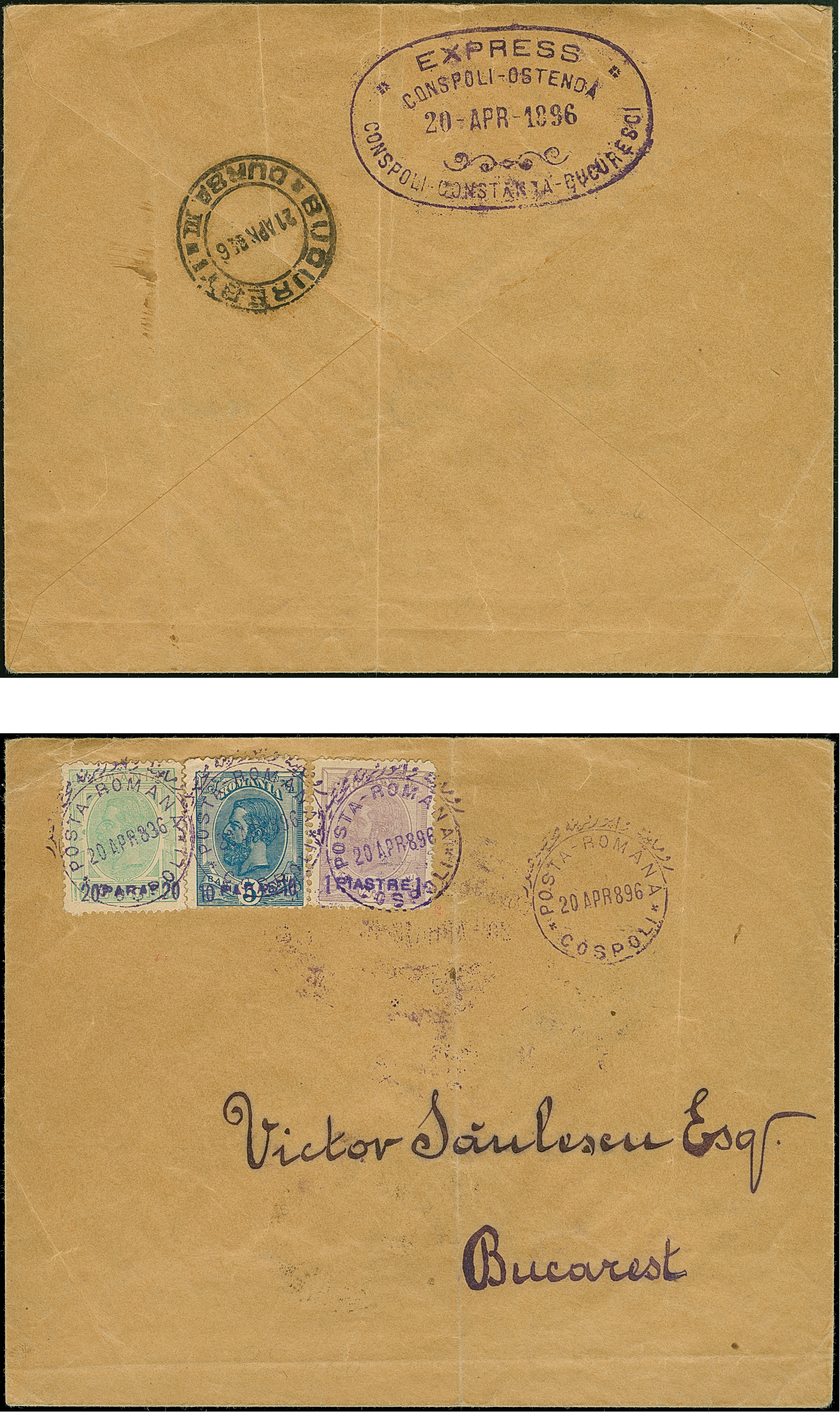 1896, Ship Mail complete set of three values with violet overprints tied on envelope by, a used example to Bucharest cancelled by wreathed "Posta Romana / Cospoli 20.Apr 896" datestamps in violet, on reverse oval framed Ship Mail handstamp "EXPRESS / CONSPOLI-OSTENDA / CONSPOLI-CONSTANTA-BUCURESCI 20-Apr-1896" and Bucharest (April 21) arrival mark alongside. Tiny vertical crease, otherwise fine and Scarce - this is not an Orient Express usage: the Romanian Postal Agency was moored on an RSC vessel in Constantinople.