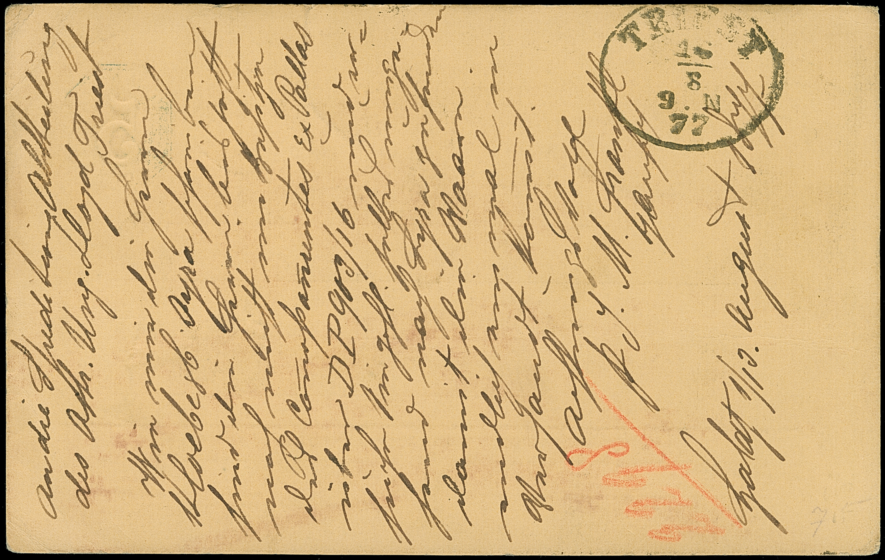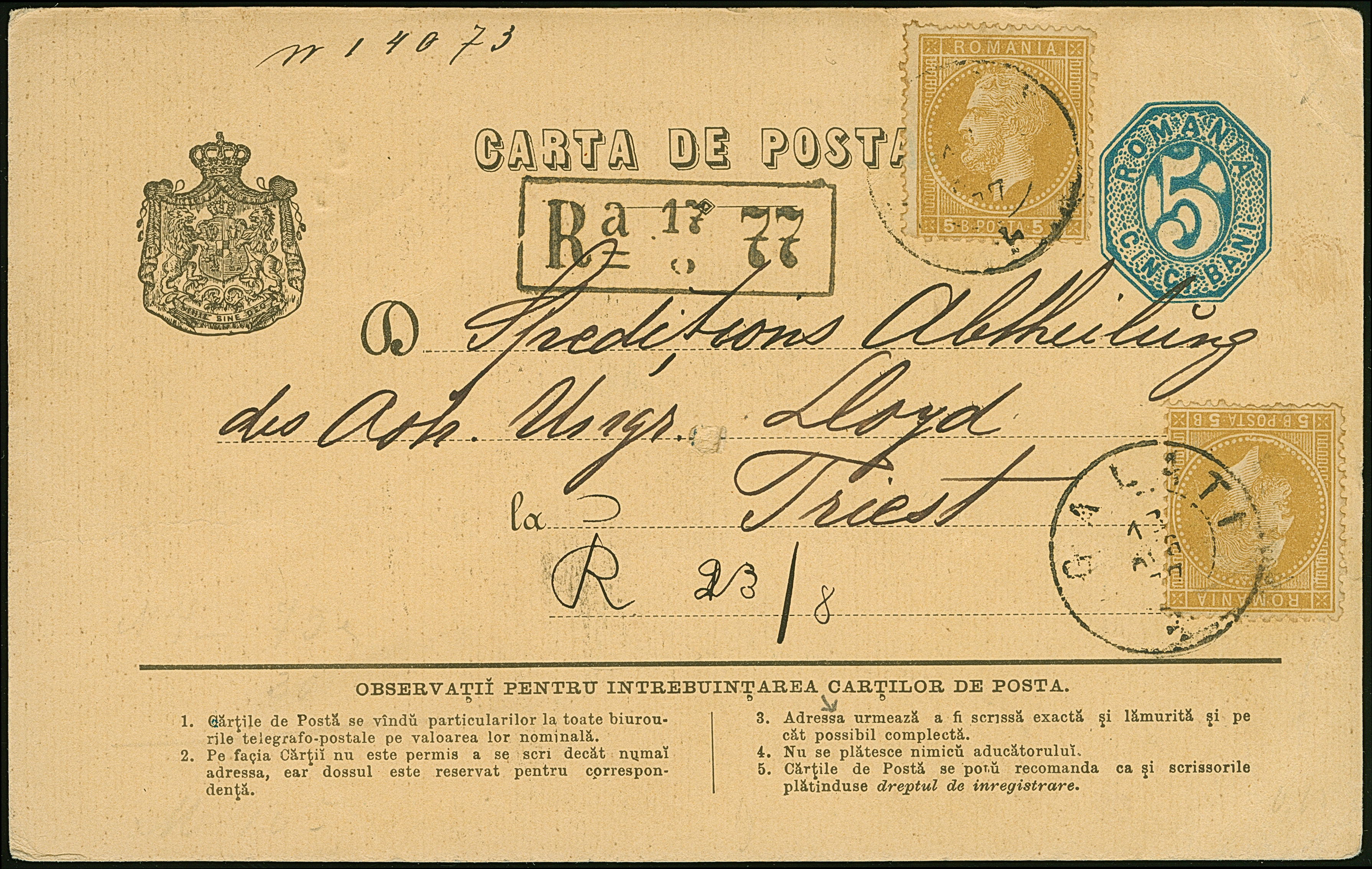 1877, GALATI 13.AUG.77 cds. in black on 5 b. postal stationery card used uprated with two 5 b. ochre, registration mark “Ra=17/77” in black and ms."R23/8" alongside, addressed to “Speditions Abteilung des Österr. Ungar. Lloyd in Triest”, transportet via Danube and black sea with Austrian ship, arrival mark TRIEST 16.8.77 on reverse, tiny border crease, otherwise fine and a very scarce registered usage