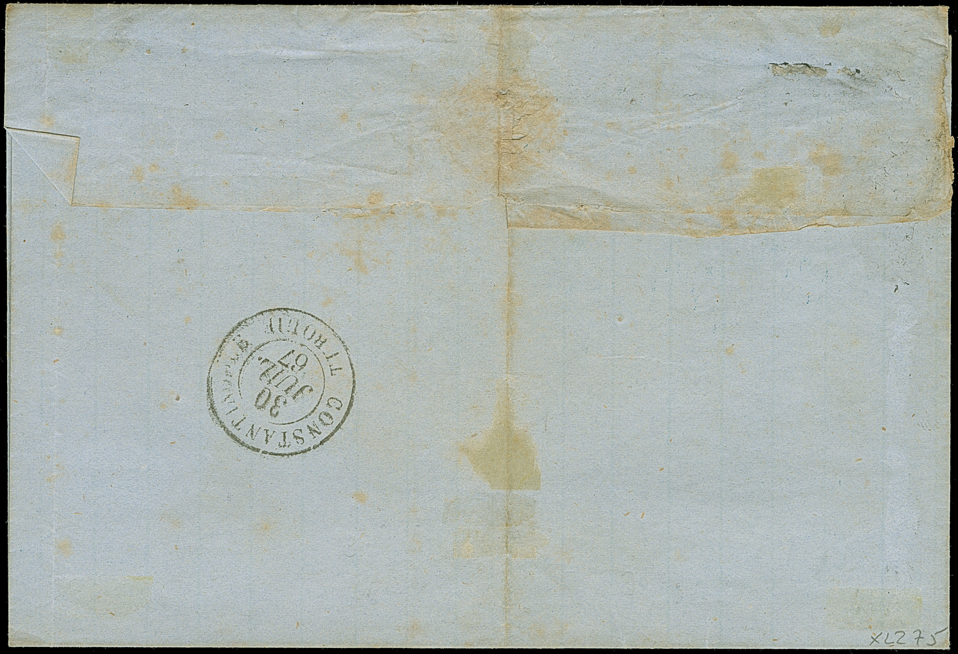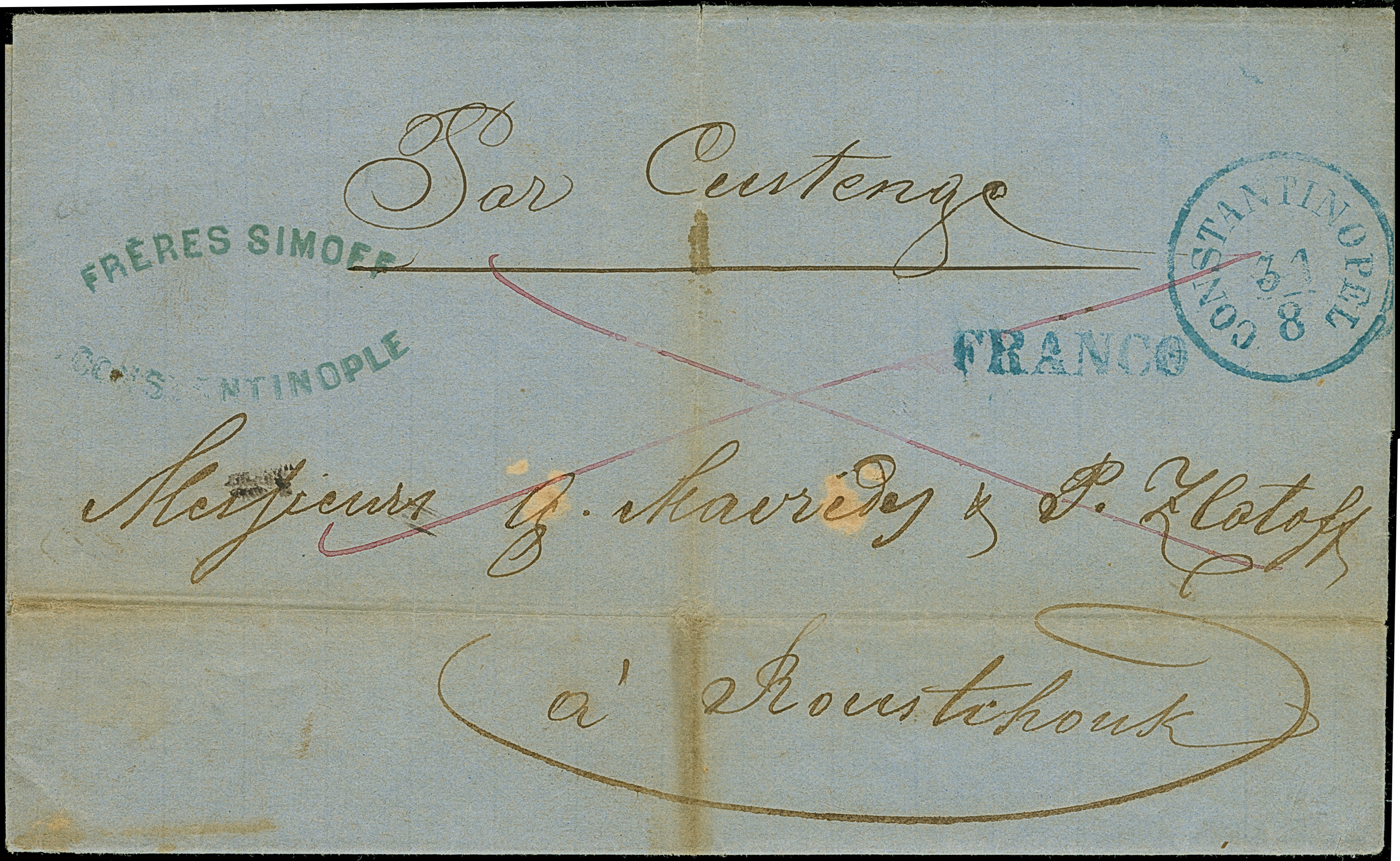 1863, Folded envelope cancelled CONSTANTINOPLE 31/8 in blue (Tchilinghirian fig. 387) and FRANCO alongside, endorsed 'via Kustendje' (Constanza), sender cachet ‘Freres Simoff Constantinople’. The route of the cover is very interesting, from Constantinople by Lloyd ship to Kustendje, per Danube and black sea railway DBSR to Cernowoda and by DDSG to Roustschouk, file folds and tiny toned, otherwise fine. Nice postal history.