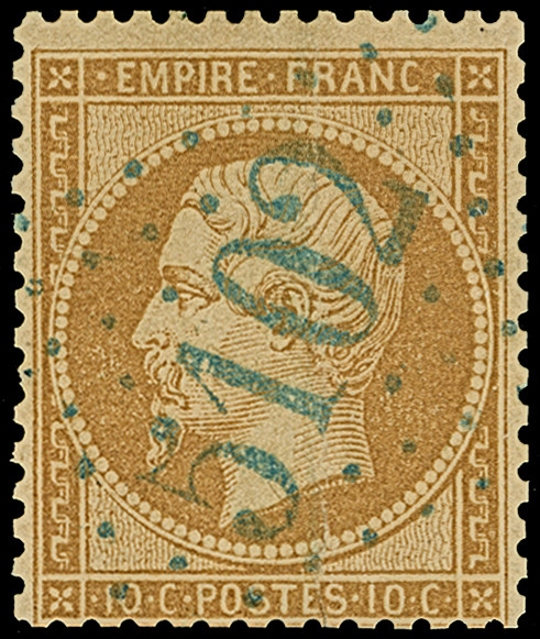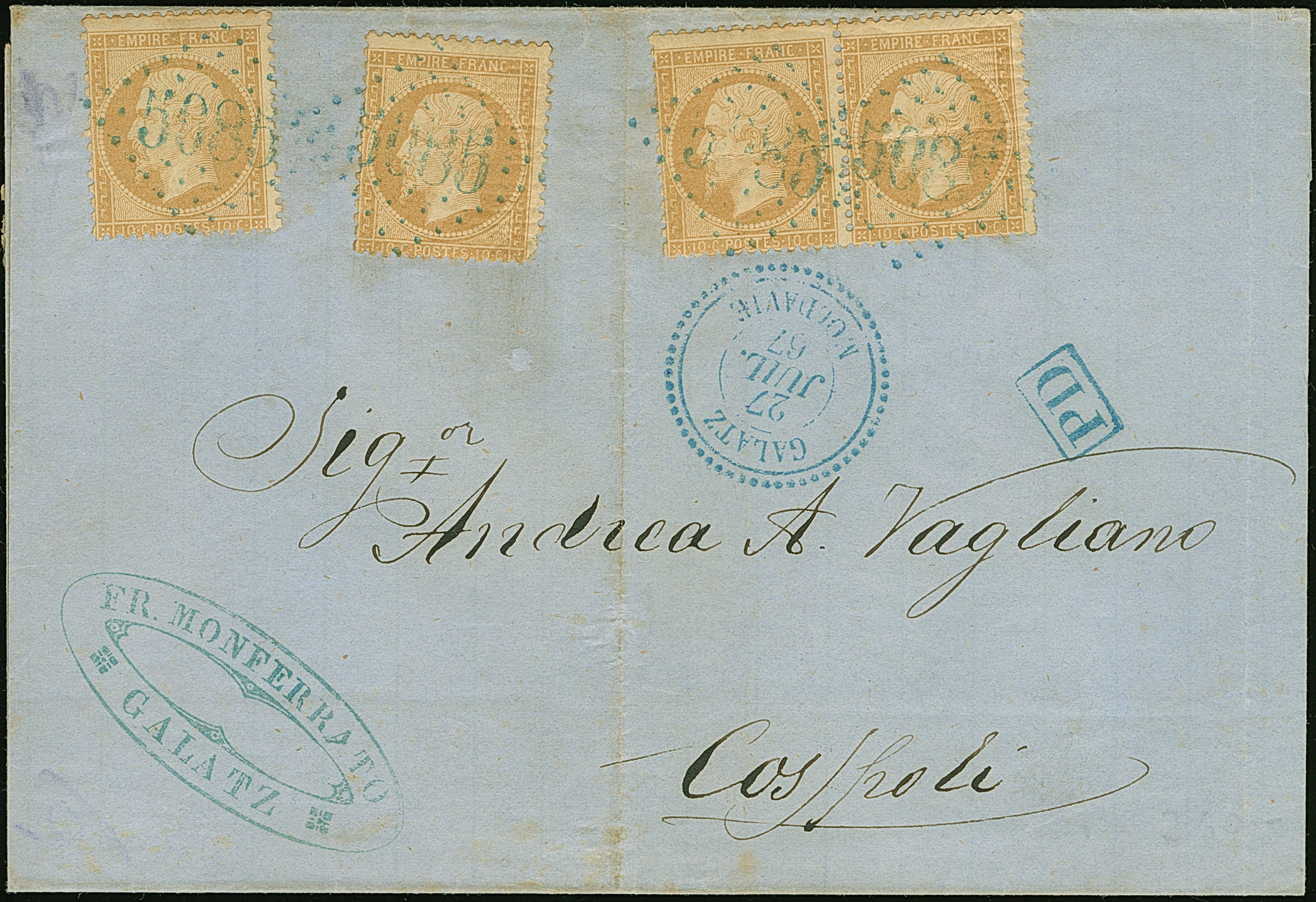 GALATZ: "5085", GC in blue, clear on horizontal pair and 2 singles Napoleon perforated 10 c. bistre, on letter sheet with adjacent blue dotted c.d.s. "GALATZ MOLDAVIE 27 JUIL 67" to Constantinopel. The pair affixed with horizontal crease and one single stamp with small corner fault, still fine and attractive. A rare multiple franking for the single rate.