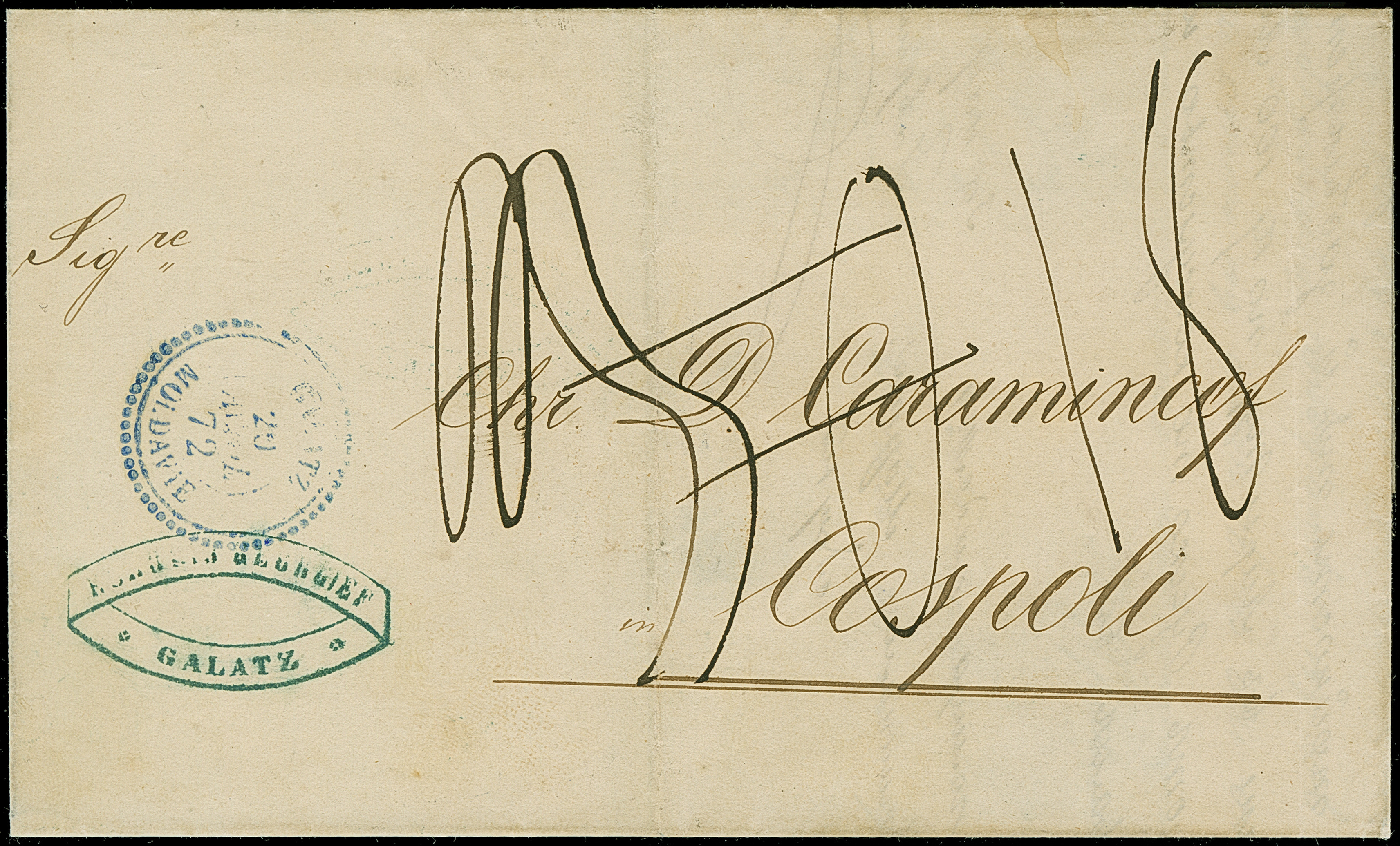 "GALATZ MOLDAVIE 20 AVRIL 72", blue dotted c.d.s. on unpaid lettersheet to Constantinopel