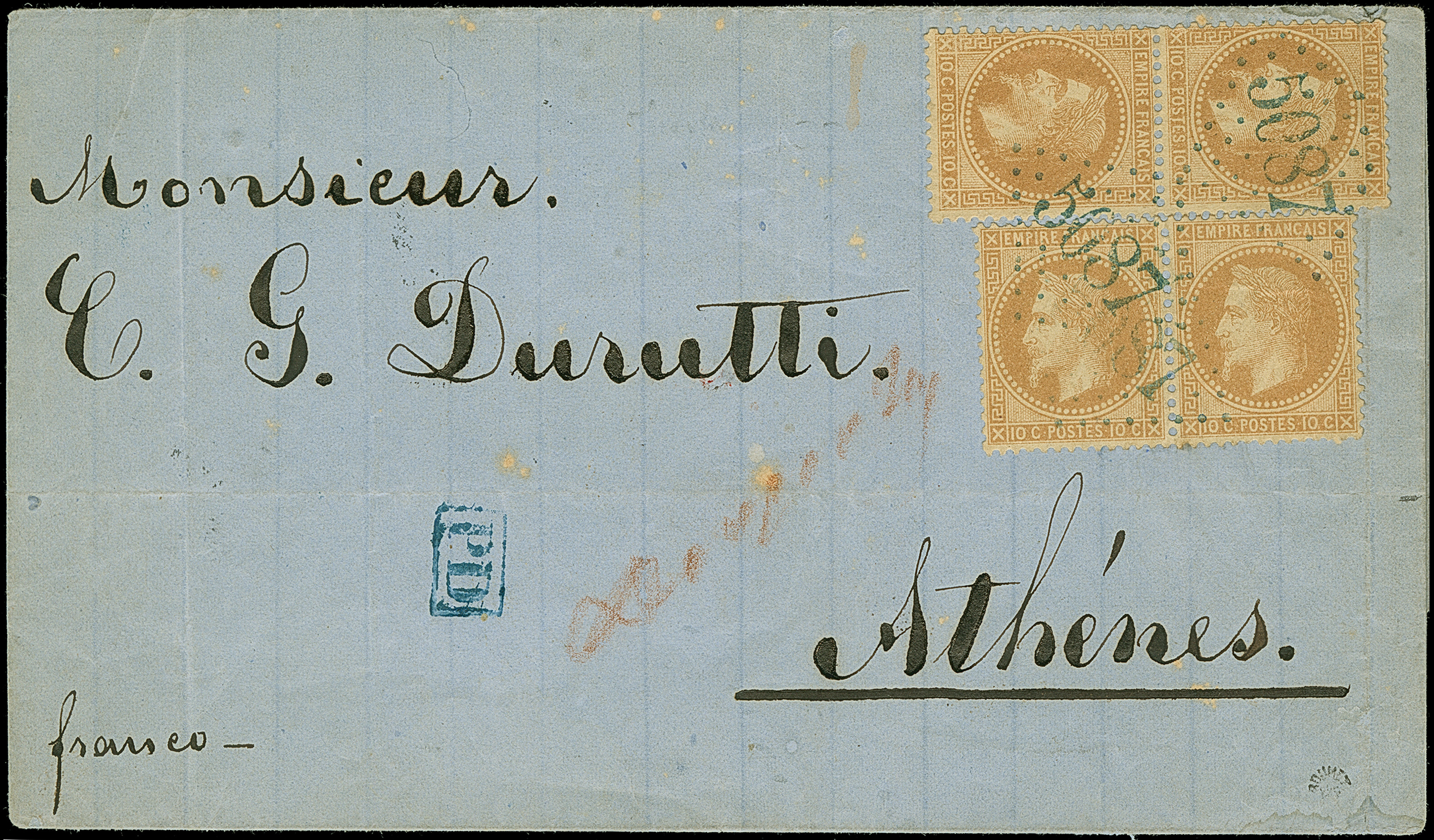 IBRAILA: "5087", GC in blue, clear on 2 pairs Napoleon lauré 10 c. bistre, on letter sheet without dispatch mark to Athens, with transit and arrival marks. One stamp with small faults, where applied over the edge of the entire, otherwise fine. A very scarce cover.