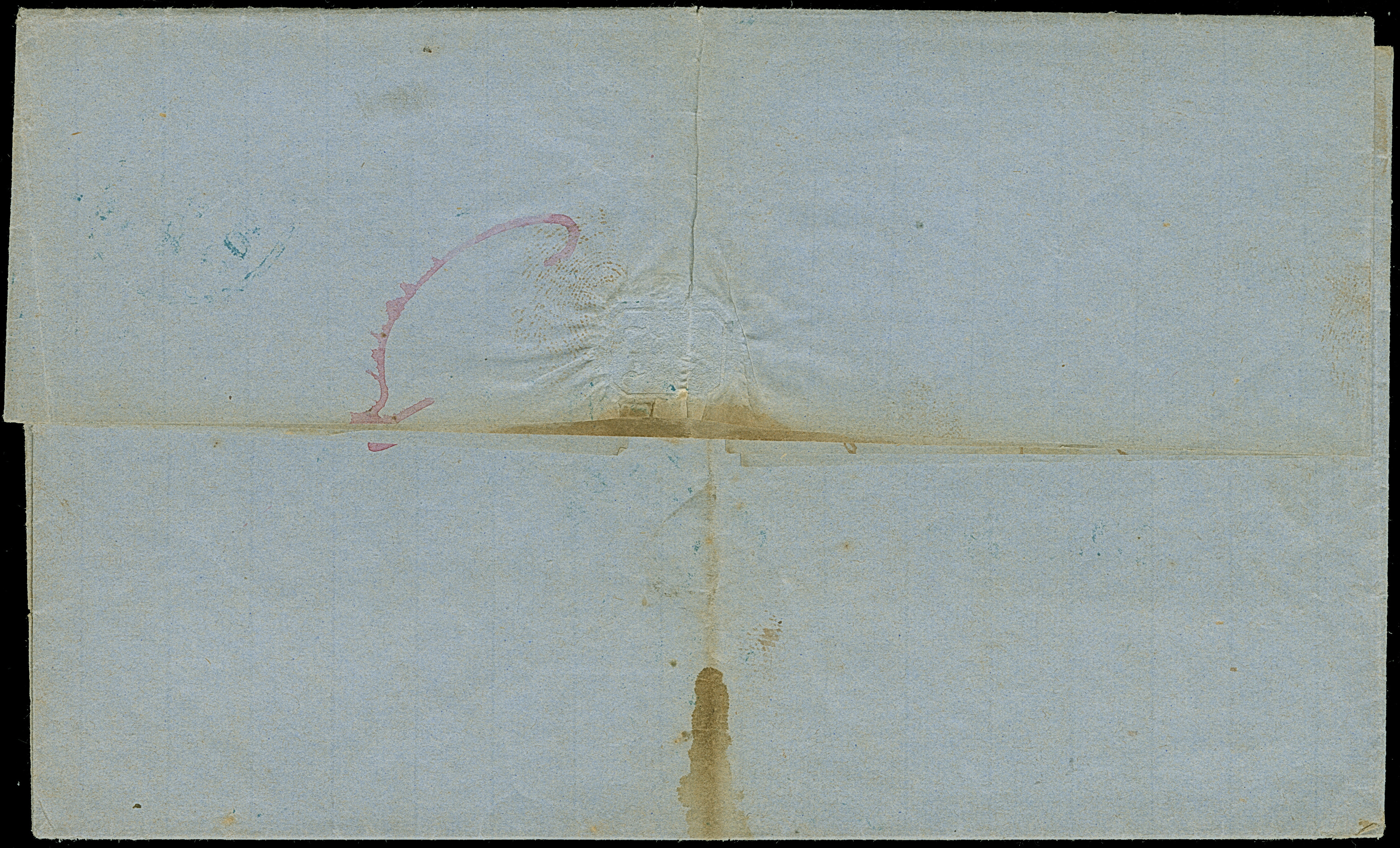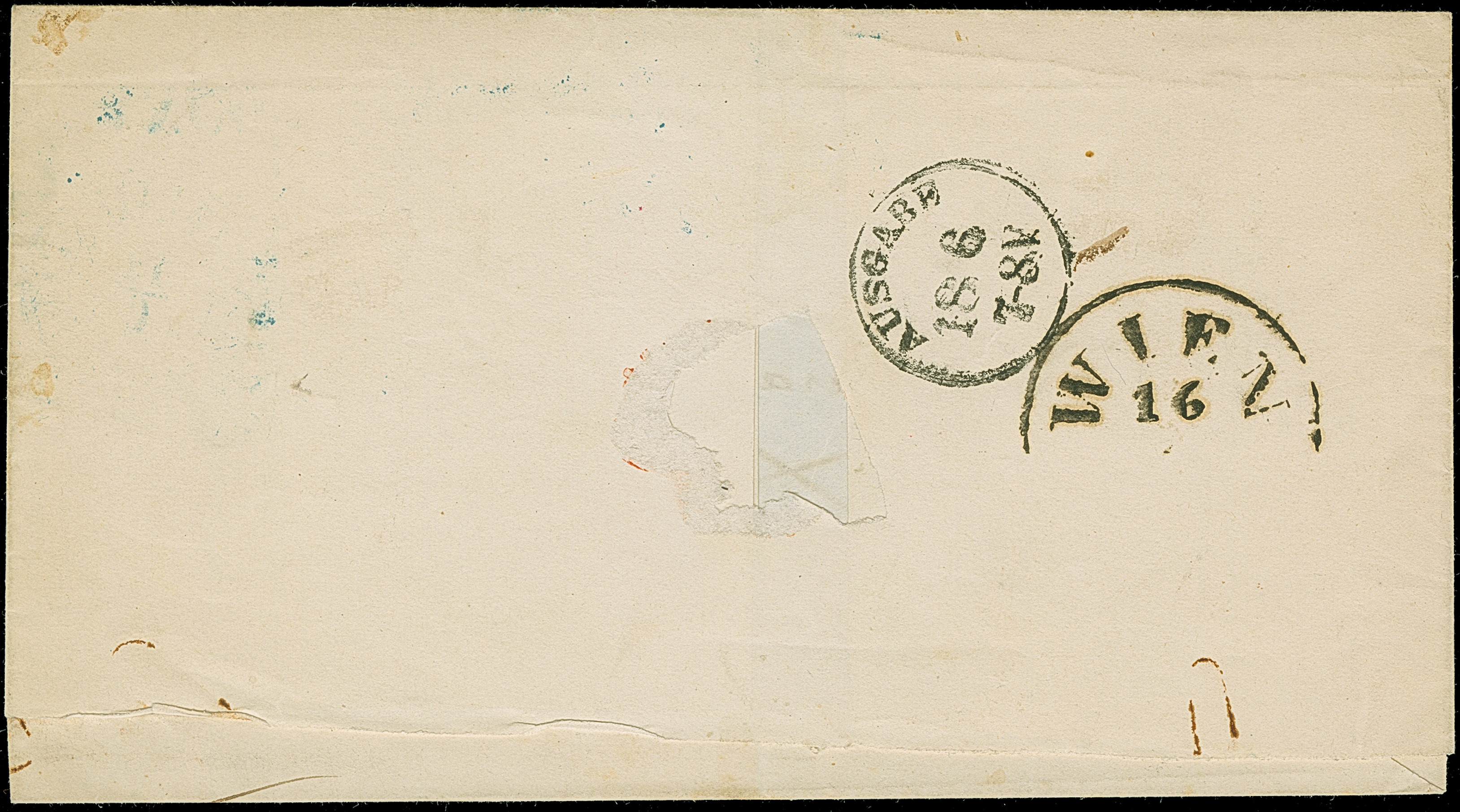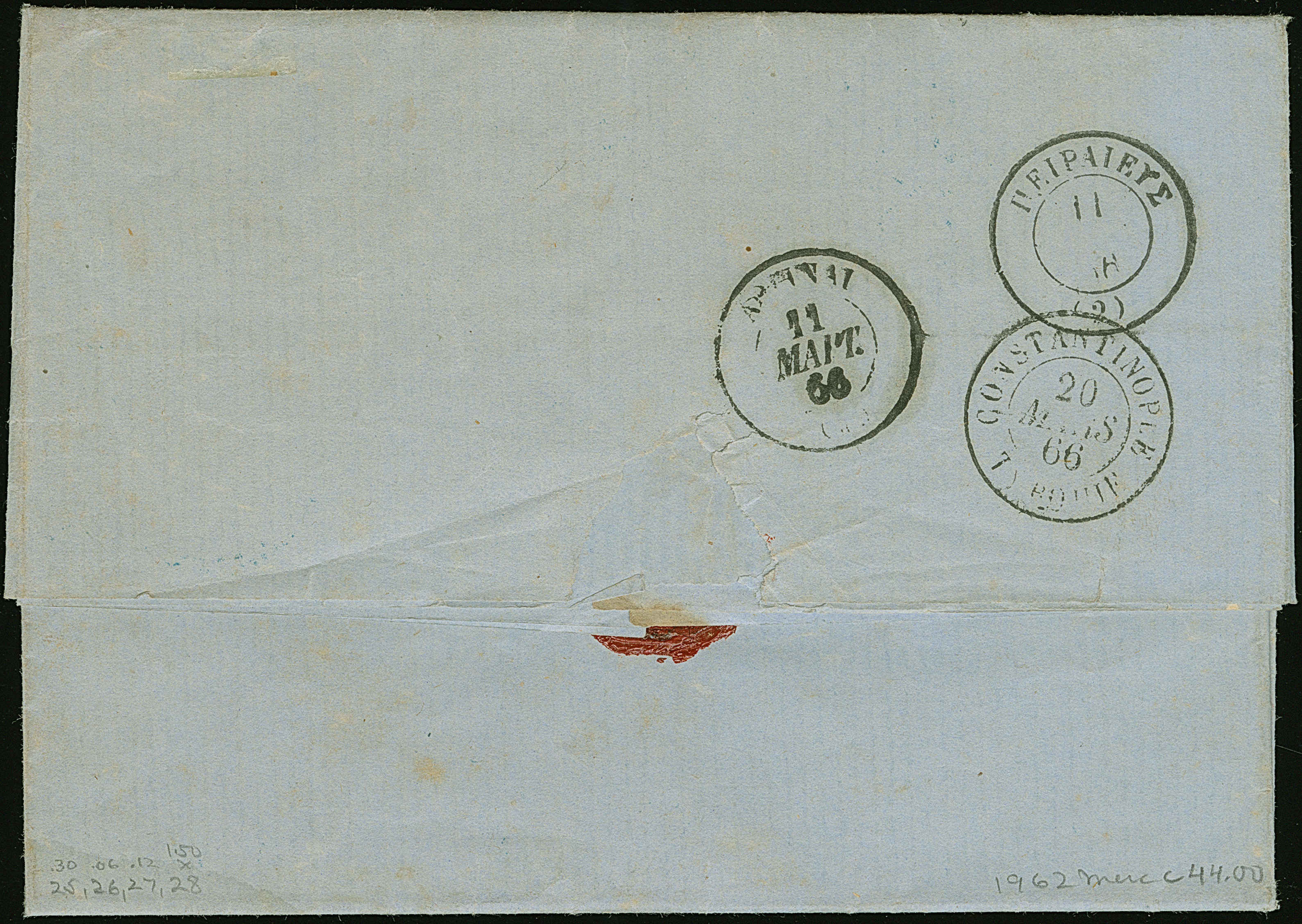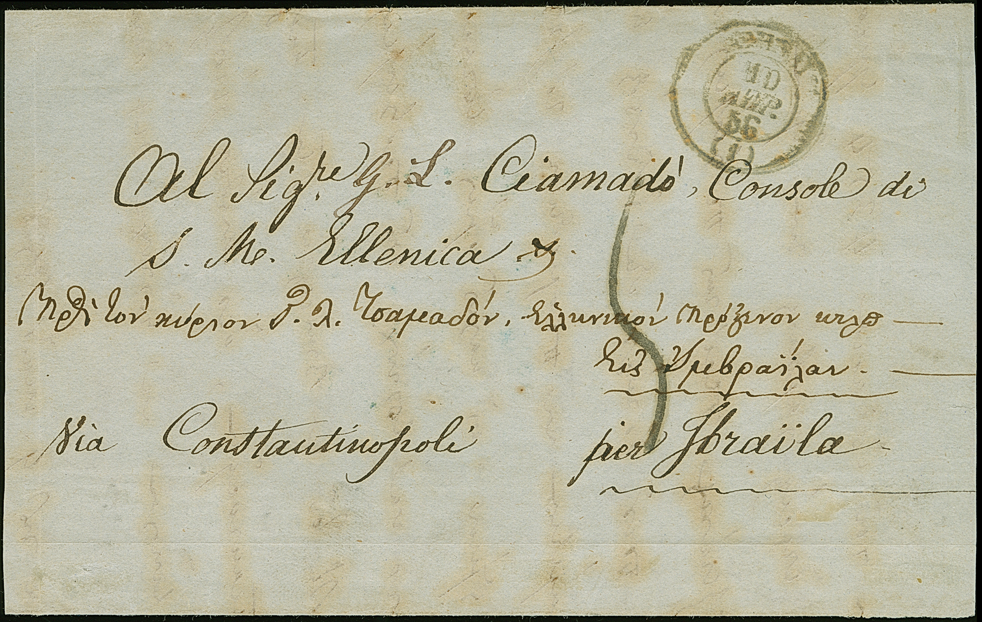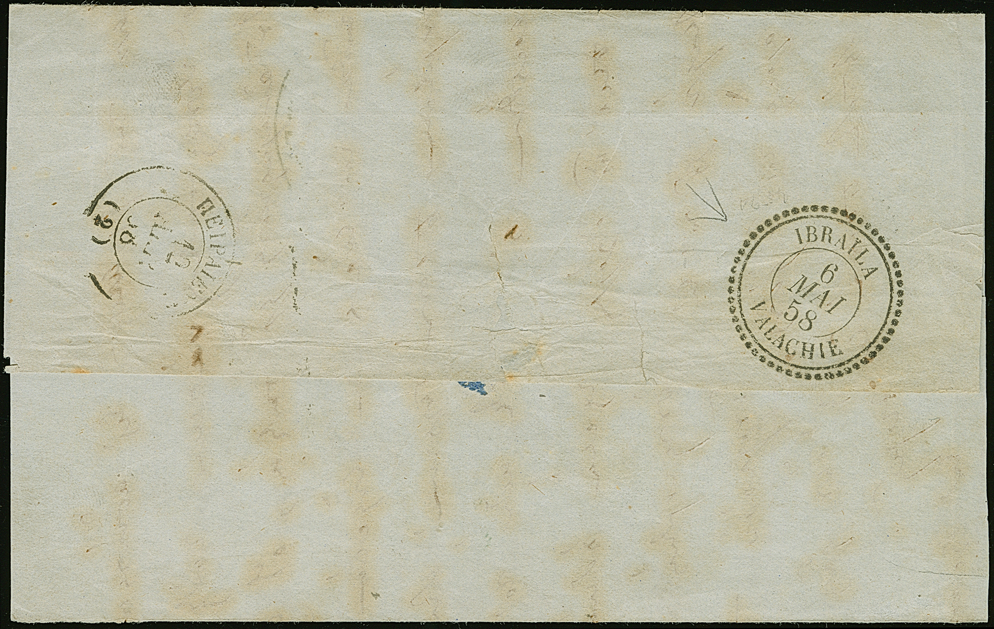 "IBRAILA VALACHIE 6 MAI 58", dotted c.d.s. in black, as arrival mark on lettersheet (two side flaps missing) from Athens, endorsed 'Via Constantinopoli', to Ibraila, taxed with "5" decimes.