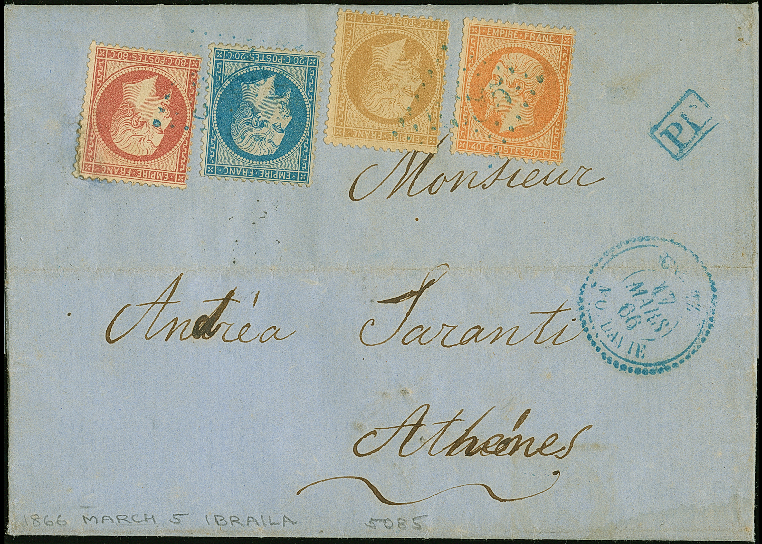 GALATZ: "5085", GC in blue, on Napoleon perforated 10 c. bistre, 20 c. blue, 40 c. orange and 80 c. carmine, on entire letter, written in Ibraila, with adjacent blue dotted c.d.s. "GALATZ MOLDAVIE 17 MARS 66" via Constantinopel to Athens. 80 c. with small corner fault (backed) and 40 c. light corner crease, otherwise fine and attractive. A rare colour franking.