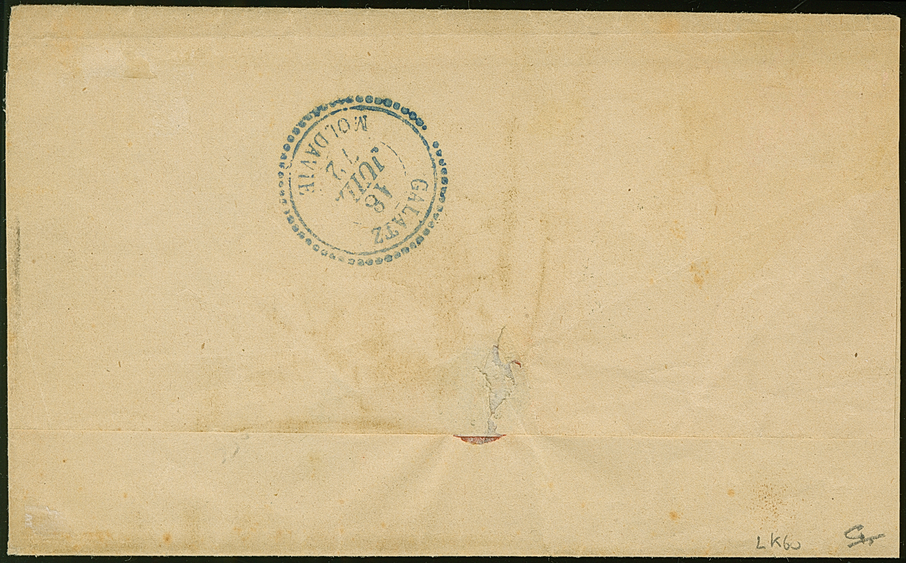 "GALATZ MOLDAVIE 18 JUIL 72", blue dotted c.d.s. as arrival mark on reverse of lettersheet from Varna, franked with Napoleon lauré 40 c., tied by blue GC "5103". Fine and scarce. Signed Todd.