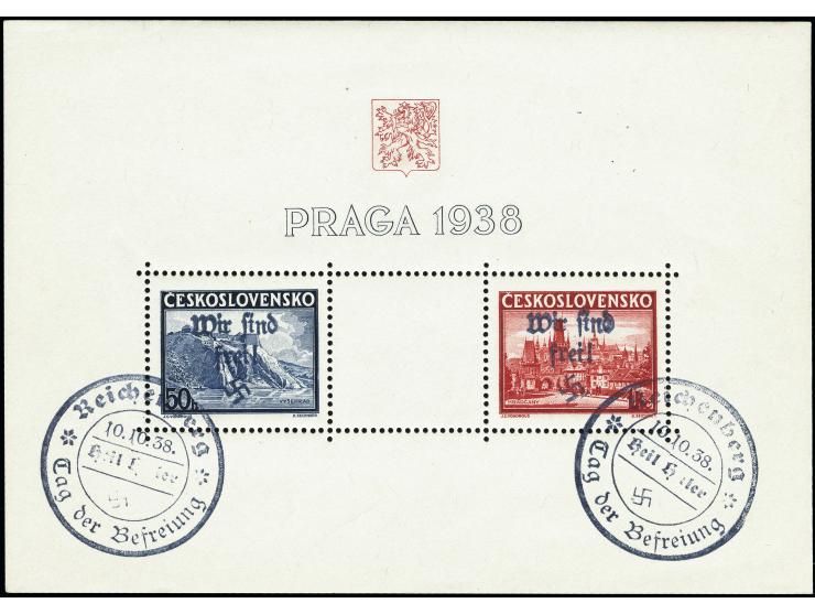Briefmarkenausstellung Praga 1938 Blockausgabe, sauber gestempelt "REICHENBERG 10.10.38", tadellos, selten, sign. Reibg HP sowie Fotoattest Brunel (2020)