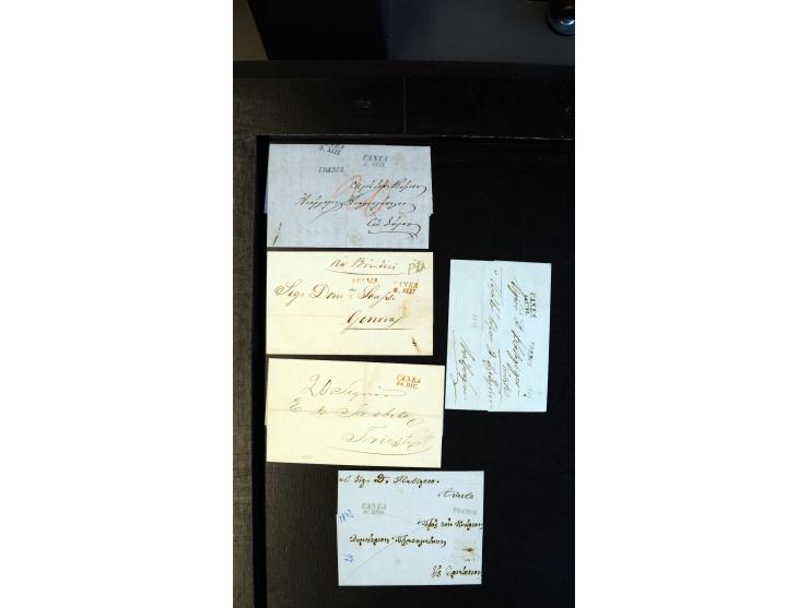 Canea 1849/71: Three covers only and two entire folded letters, marked with a wide range of colors (oily brown, black, blue and green) of type 2 datestamp in two lines "CANEA". Four of them with additional "Franca" marking. Included, a rare letter to Genova with green "PD". Clean and scarce material