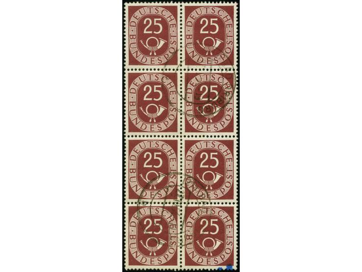 25 Pfennig im senkrechten 8er-Block, gestempelt "(21a) BAD DRIBURG 27.10.54", in der Zähnung gefaltet, ausgabetypisch gezähnt, rechts unten kleiner Tintenfleck, sonst einwandfrei, selten