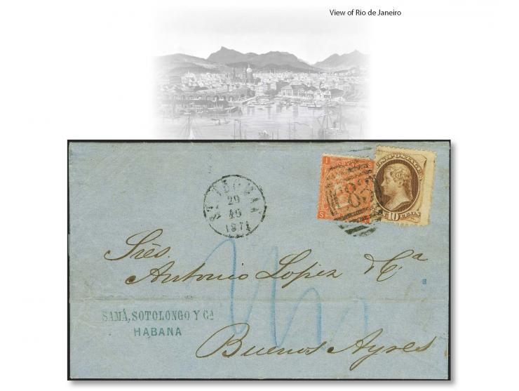 1871 folded letter, datelined Havana, 16 October, from the firm of Sama, Sotolongo Y. Ca, to Buenos Ayres, Argentina, franked with combination 10c brown Bank Note issue of the United States and 1865 3d vermilion of Great Britain, carried privately to St. Thomas, postmarked there on 29 October, the 10c prepaying conveyance to Rio de Janeiro via the United States & Brazil Steamship Co, cancelled on receipt by the British Post Office in Rio with “C83” numeral grid, “2/4” due in blue manuscript, carried onwards to Buenos Aires via Pacific Steam Navigation Co. vessel, docketing indicating receipt on 25 November, horizontal fold well clear of adhesives, 4d franking with upper right corner fault, a remarkably scarce entire; with 2002 Philatelic Foundation certificate