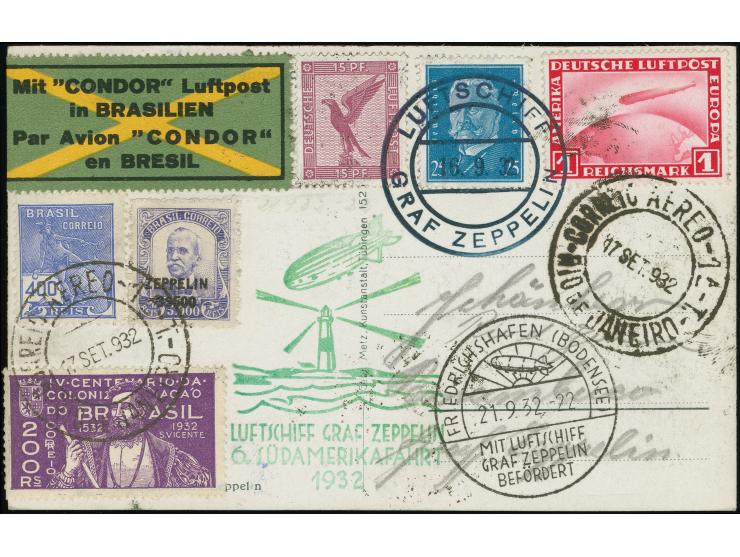 1932, 6. Südamerikafahrt, Fotokarte mit u.a. Zeppelin 1 Mark mit Bordstempel vom 16.9. nach Pernambuco und umadressiert an Schönherr in Friedrichshafen mit Auflieferung Brasilien vom 17.9. mit u.a. Zeppelin-Aufdruckmarke 3.500 Reis und vorderseitigem Ankunftsstempel “FRIEDRICHSHAFEN 21.9.32” in guter Erhaltung
