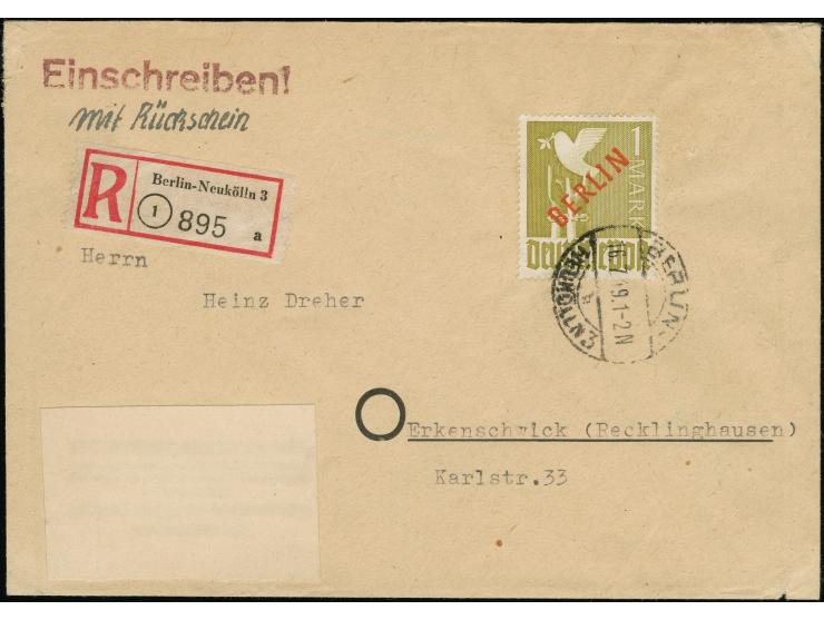 Rotaufdruck 1 Mark mit Stempel “BERLIN-NEUKÖLLN 3 16.7.49” als portogerechte Einzelfrankatur auf R-Rückschein-Brief nach Erkenschwick mit rückseitigem Postvermerk. Der Umschlag mit senkrechter Faltung und Beförderungsspuren im Rand, sonst in guter Gesamterhaltung. Eine in dieser Kombination sehr seltene Einzelfrankatur, signiert Schlegel BPP