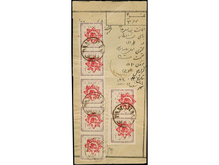 1 kr., vertical strip of five and pair, tied by c.d.s. "DAMGHAN" to parcel post waybill to Teheran. Fold between two stamps of the strip. Largest recorded multiple of this stamp on entire. Signed Holcombe with opinion (1989).