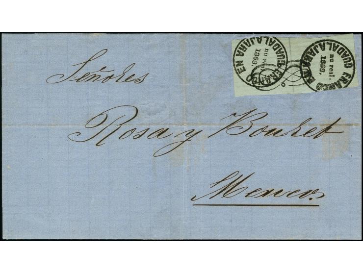 1868, laid paper, 1 r. on green, vertical pair, both stamps with variety "nu" instead of "un", used with infinity handstamp on entire letter from Guadalajara to Mexico City. Very rare; just one further entire with the variety recorded. Certificate MEPSI (1997)