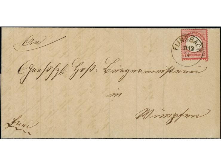 3 Kreuzer karmin, farbfrisch, gut geprägt und üblich gezähnt mit klarem EKr. “FLINSBACH 31.12.74” auf komplettem Faltbrief nach Wimpfen mit Ankunftsstempel "WIMPFEN 1.1.1875. Die Marke mit etwas Stempelfett im Prägefeld, ansonsten wie der Brief in einwandfreier Erhaltung. Ein dekorativer und seltener Brief vom Letzttag aller Brustschildmarken mit Kreuzer-Währung, Fotoattest Krug BPP (2007)