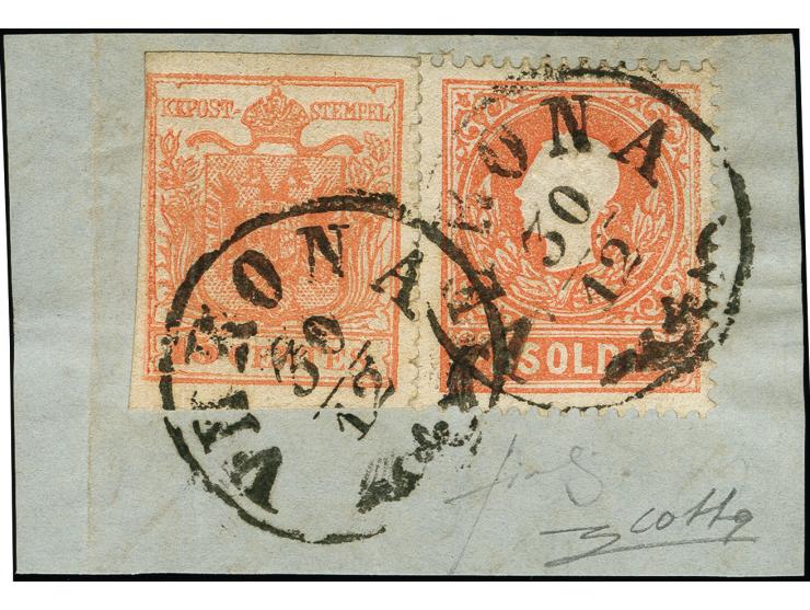 "VERONA 30/12", EKr. auf Maschinenpapier 15 Centesimi, noch voll- bis meist breitrandig, in Mischfrankatur mit 1858, 5 Soldi, farbfrisch und gut gezähnt, auf kleinem Briefstück. Eine äußerst seltene Mischfrankatur vom vorletzten Gültigkeitstag der 1. Ausgabe. Signiert Colla mit Attest (1993)
