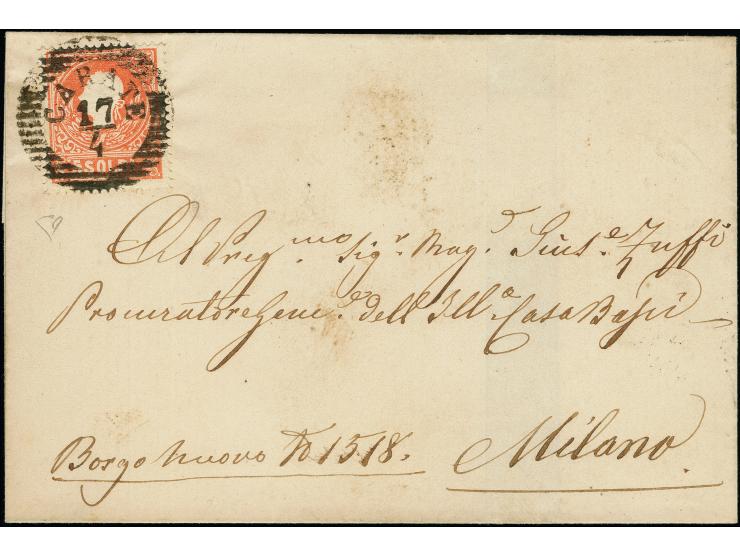 "CARATE 17/4", Kreis-Strich-Stempel auf 1858,5 Soldi in Type I, auf kleiner Briefhülle nach Mailand. Signiert Enzo Diena. (Sassone 10 Punkte)