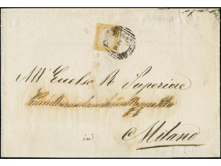 "ZOGNO 8/8", Strich-Kreisstempel auf Sardinien 80 Centesimi, noch voll- bis breitrandig, auf Briefhülle nach Mailand. Ein Teil der Adresse war überschrieben, hier gereinigt und nachempfunden. Sehr selten. Signiert Enzo Diena mit Attest (1983) (Sassone 10 Punkte)