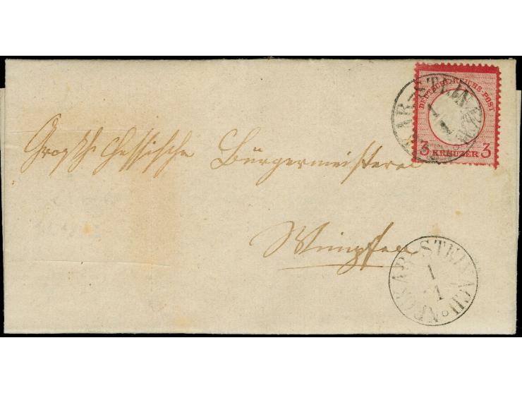 3 Kreuzer karmin, farbfrisch, deutlich geprägt mit teils kurzen Zähnen unten, mit klarem EKr. "NECKAR-STEINACH 1.1.(72) auf komplettem Faltbrief bis 15 g nach Wimpen. Die Marke ist repariert und im Faltbrief wurde links ein Stück wieder kunstvoll eingesetzt, trotz der Einschränkungen ein optisch ansprechender Brief mit Ersttagsstempel. Briefe vom Ersttag mit der 3 Kreuzer sind sehr selten, Fotoatteste Hennies BPP (1979) und Krug BPP (2024)