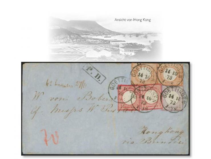 ¼ Groschen grauviolett, zwei Einzelmarken 1 Groschen karmin und senkrechtes Paar 2½ Groschen rötlichbraun je mit EKr. “GOETTINGEN 14.10.73” als tarifgerechte Frankatur auf Briefkuvert bis 15 g mit Leitvermerk “via Brindisi” mit schwarzem Handstempel “P.D.” und Rötel-Taxe “70” (Centesimi) für den italienischen Portoanteil via Brindisi nach Hongkong mit rückseitigem Stempel “HONG-KONG MARINE-SORTER SINGAPORE TO HONG-KONG NO 18.28.73”. Die farbfrischen Marken sind deutlich geprägt, sie waren gelöst und sind teils repariert, der Umschlag mit Alterspuren und senkrechter Faltung wurde gereinigt. Trotz der Einschränkungen ein ansprechender Übersee-Brief mit dekorativer Dreifarben-Frankatur und Destination Hongkong, Fotoattest Krug BPP (2016)