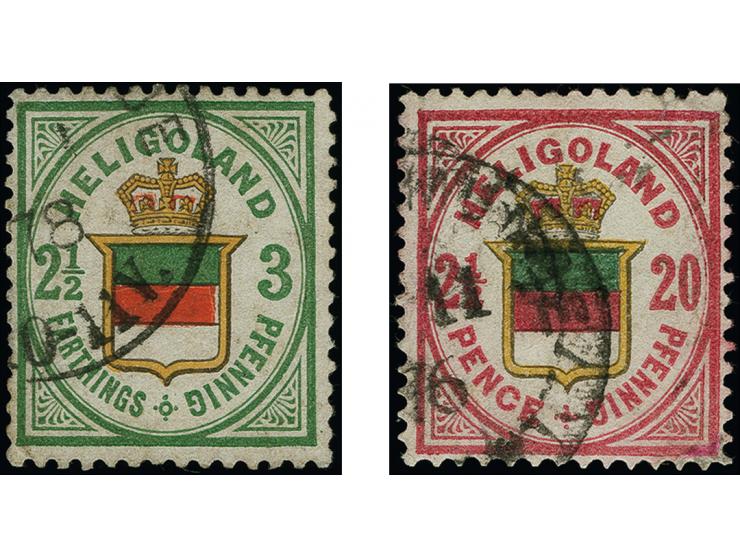 “GEESTEMÜNDE”, je Teilabschlag des EKr. auf etwas fehlerhafter 1876 3 Pfennig grün/orange/zinnoberrot sowie 20 Pfennig lilakarmin/gelb/blaugrün, eine sehr seltene Entwertung, insbesondere auf diesen Marken, sign. Lemberger bPP