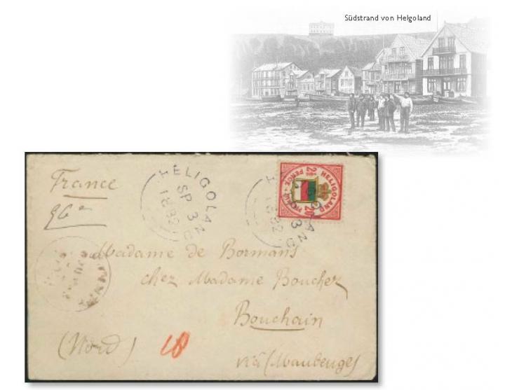 1876, 20 Pfennig hellrosalila/graugelb/graugrün, sauber mit Kreisbogenstempel “HELIGOLAND SP 3 1882” auf Briefkuvert mit nebengesetztem violetten EKr. "PAID Franco HELIGOLAND" nach Bouchain, Frankreich, die Marke und Kuvert kleine Einschränkungen, ein trotzdem ansprechender Brief