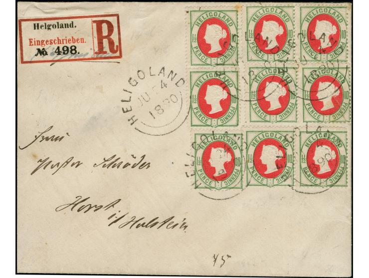10 Pfennig hellgrün/mittelrot, drei waagerechte sowie ein senkrechtes Paar und ein Einzelwert, farbfrisch und meist gut gezähnt, sauber mit Kreisbogenstempeln “HELIGOLAND JU 24 1890” auf engeschriebenem Brief nach Horst in Holstein mit Ankunftstempel, das Kuvert einmal senkrecht gefaltet, ein Wert winzig stockig, sonst in guter Erhaltung und eine ansprechende Mehrfachfrankatur, Fotoattest Schulz BPP (2000)